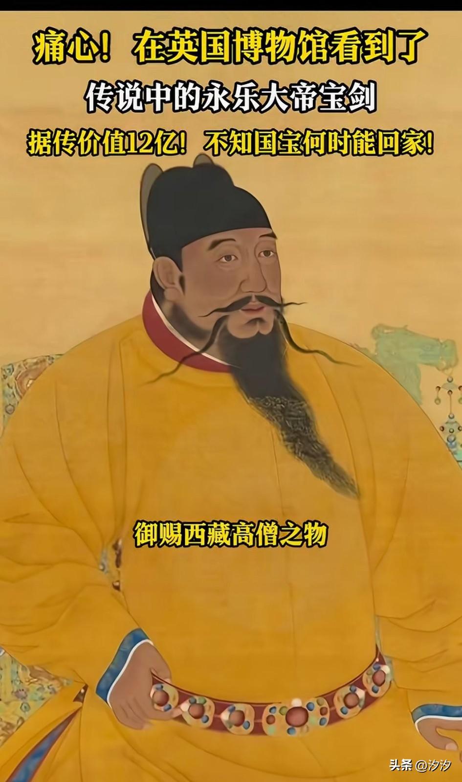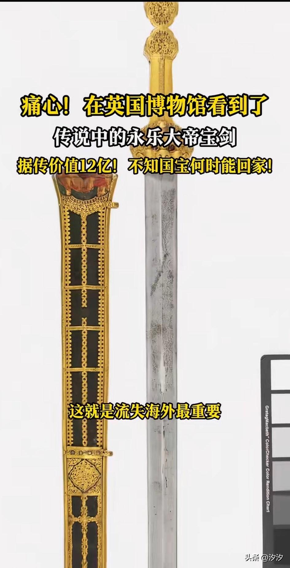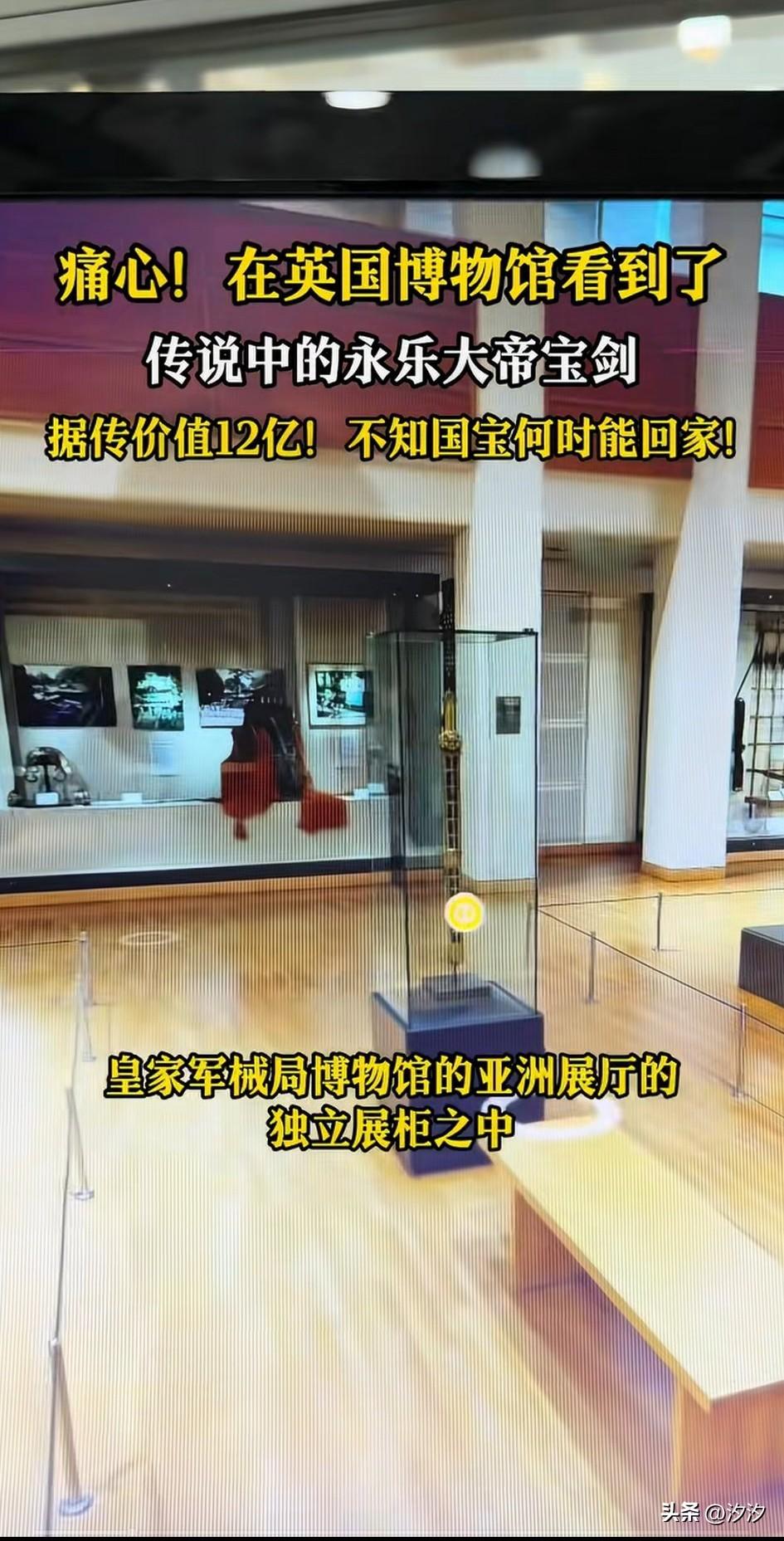 创新在英国博物馆看到了永乐大帝宝剑,这是目前世界上唯一存在的一把永乐大帝的剑,它就存放在英国皇家军械局博物馆,现场看起来非常震撼, 剑身通体鎏金,还雕刻了很多花纹儿, 剑柄上塑造了一个神兽, 看着栩栩如生, 剑身泛着白光, 历经600年,依然锋利, 推测朱棣将这把剑送给了藏族高僧, 是中国古代冷兵器的巅峰之作, 可惜到了清代晚期, 八国联军侵华的时候流落海外, 如今被放在了英国利兹皇家军械博物馆,我们才能看到他的真容, 这把剑目前价值12亿, 也不知道什么时候能够归国?