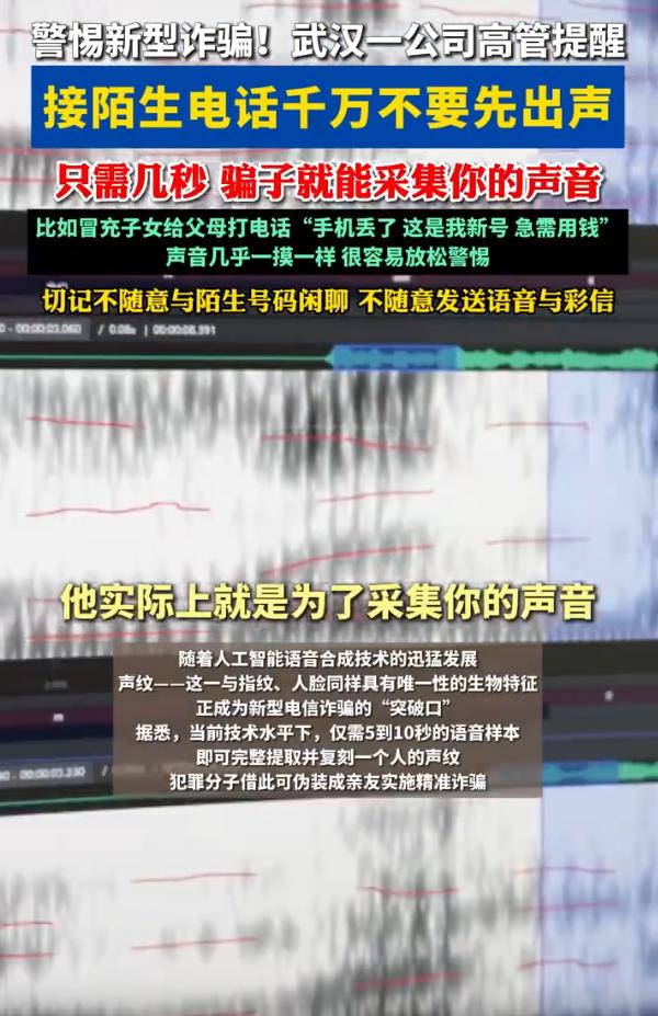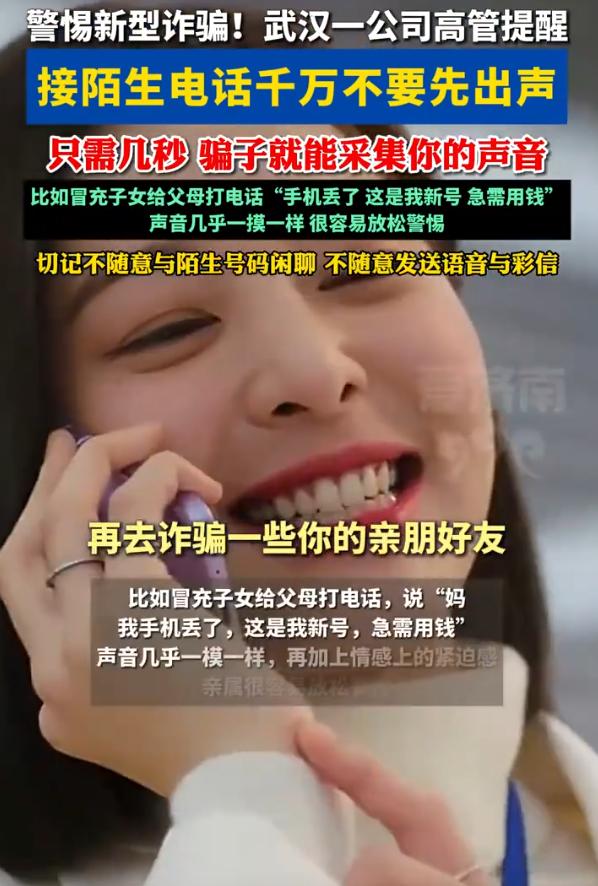 防不胜防!湖北武汉,一科技公司高管在接受采访时提醒,接到陌生电话时不要先出声,不要以为识别出对方是诈骗电话就放下戒备,因为我们的声音只需要几秒钟就可能被对方用AI采集下来,到时候受骗的可能就是家人了 你能想象吗?就因为你接了一个电话,说了几个字,你爸妈、你爱人,可能下一秒就被骗走一辈子的积蓄。这不是危言耸听,这是正在发生的事情 过去我们熟悉的那一套,冒充客服退款、冒充公检法恐吓,确实还在,但已经不是最狠的了。现在真正让人防不胜防的,是AI声音诈骗 骗子用的手段其实并不复杂。他们先通过虚拟号码给你打电话,装作快递员、运营商客服,甚至说是做街头调研的。电话里的话术听起来特别正常,比如麻烦核对一下尾号、请问您是机主本人吗、您的快递到了需要确认一下姓名。就这么几句,听着毫无攻击性,很多人不会多想,随口就回答了 但就在这几秒里,你的声音已经被录了下来。哪怕你只是说了嗯、是、我是,或者报了一下自己的姓氏,这些碎片就足够AI用了 你以为不过是一个无关紧要的电话,挂了就没事了。可你不知道的是,在另一边,你的声音正在被拆解、重组,合成一段几乎听不出破绽的语音 接下来,才是真正要命的一步 骗子拿着这段合成的你的声音,打电话给你最亲近的人——你的父母、你的伴侣、你的孩子。电话那头,是你的声音,带着哭腔,或者带着急迫,说自己出了车祸,急需医药费;说自己被绑架了,要赎金;说自己欠了钱,被人堵住了,必须马上转钱 说句实在话,技术上我们普通人很难去对抗。但你至少可以做到一件事:给自己和家人立一个规矩 不管是谁打来电话,只要是涉及到钱、转账、借钱、救急这些事情,哪怕声音再像,也一定要挂掉电话,主动回拨确认。不要用对方打过来的那个号码回拨,要打你自己存的、你最熟悉的那个号码 这一条规矩,看起来很笨,但它能挡住绝大部分用AI合成的骗局。因为骗子只能模拟你的声音,他没有办法控制你的手机号 另外,平时接到陌生电话,尤其是那种一上来就让你说话的,不妨先不开口,让对方先说。或者用一些简单的嗯、哦应付,尽量不要清晰地回应。你越少给出完整的声音样本,骗子就越难采集到有用的素材。 接陌生电话别先出声 骗子可采集声音