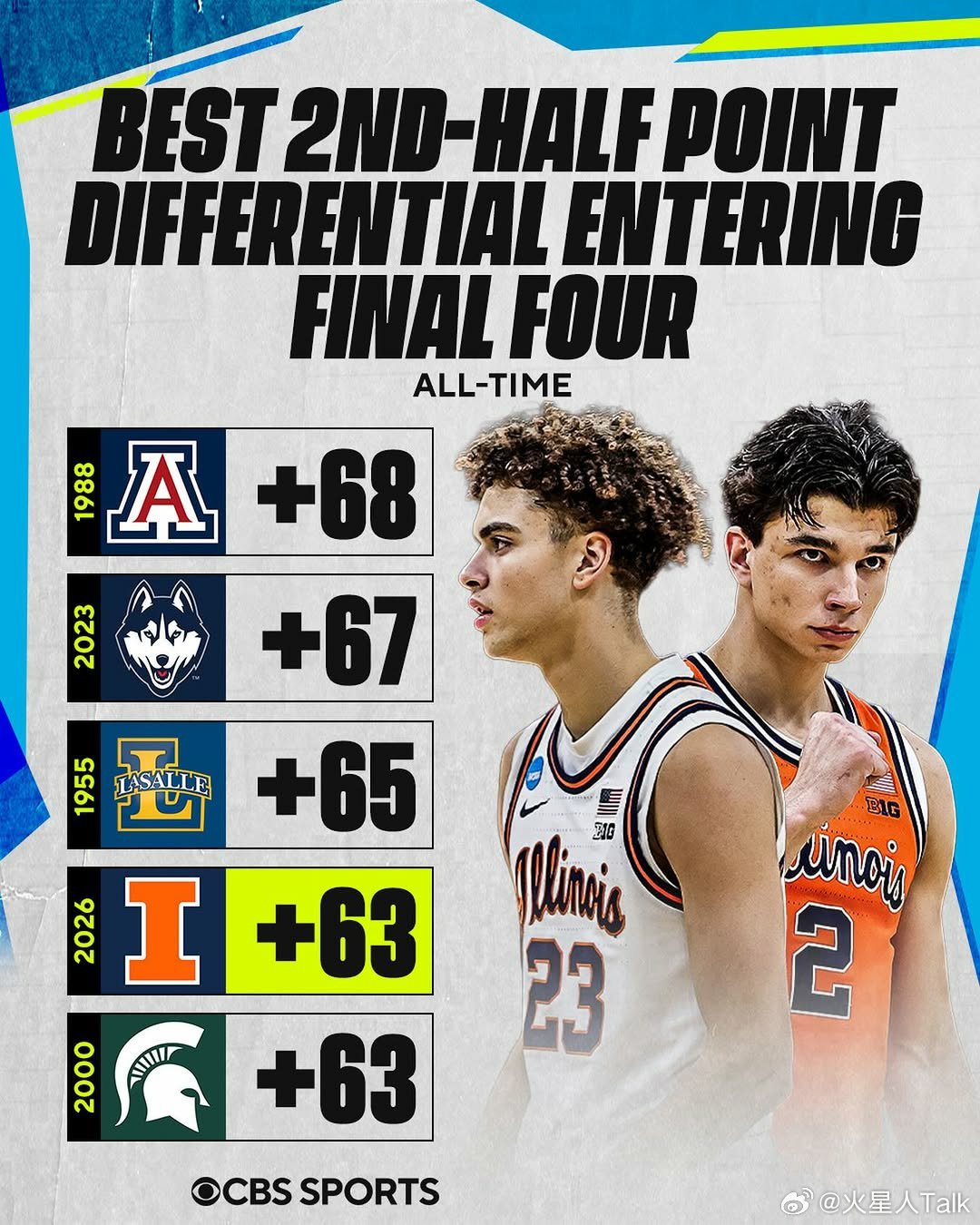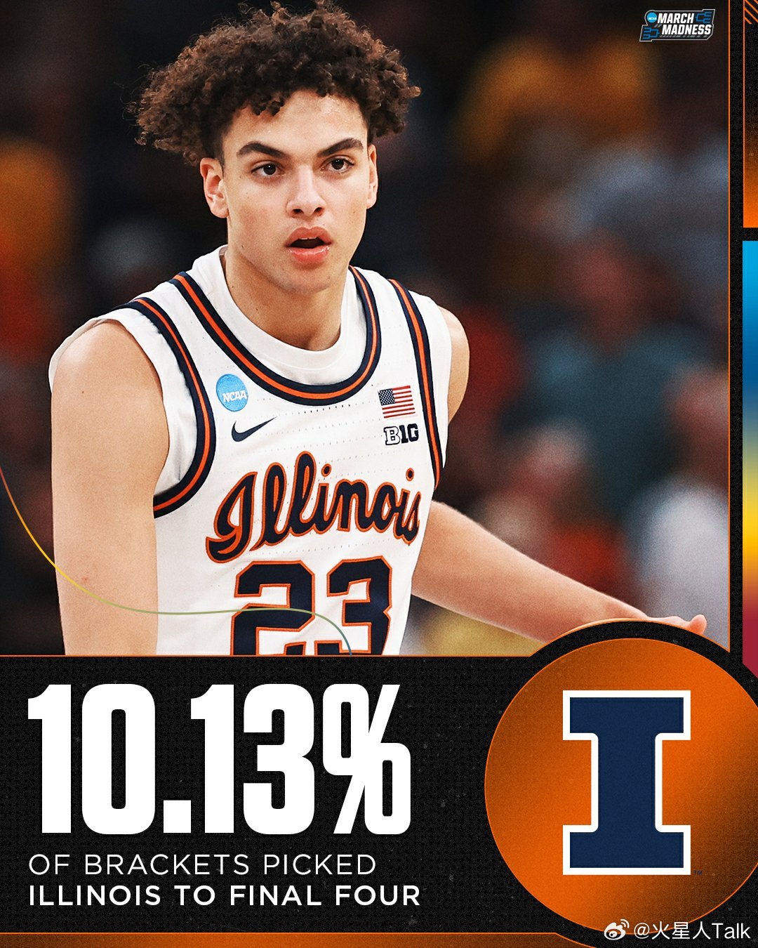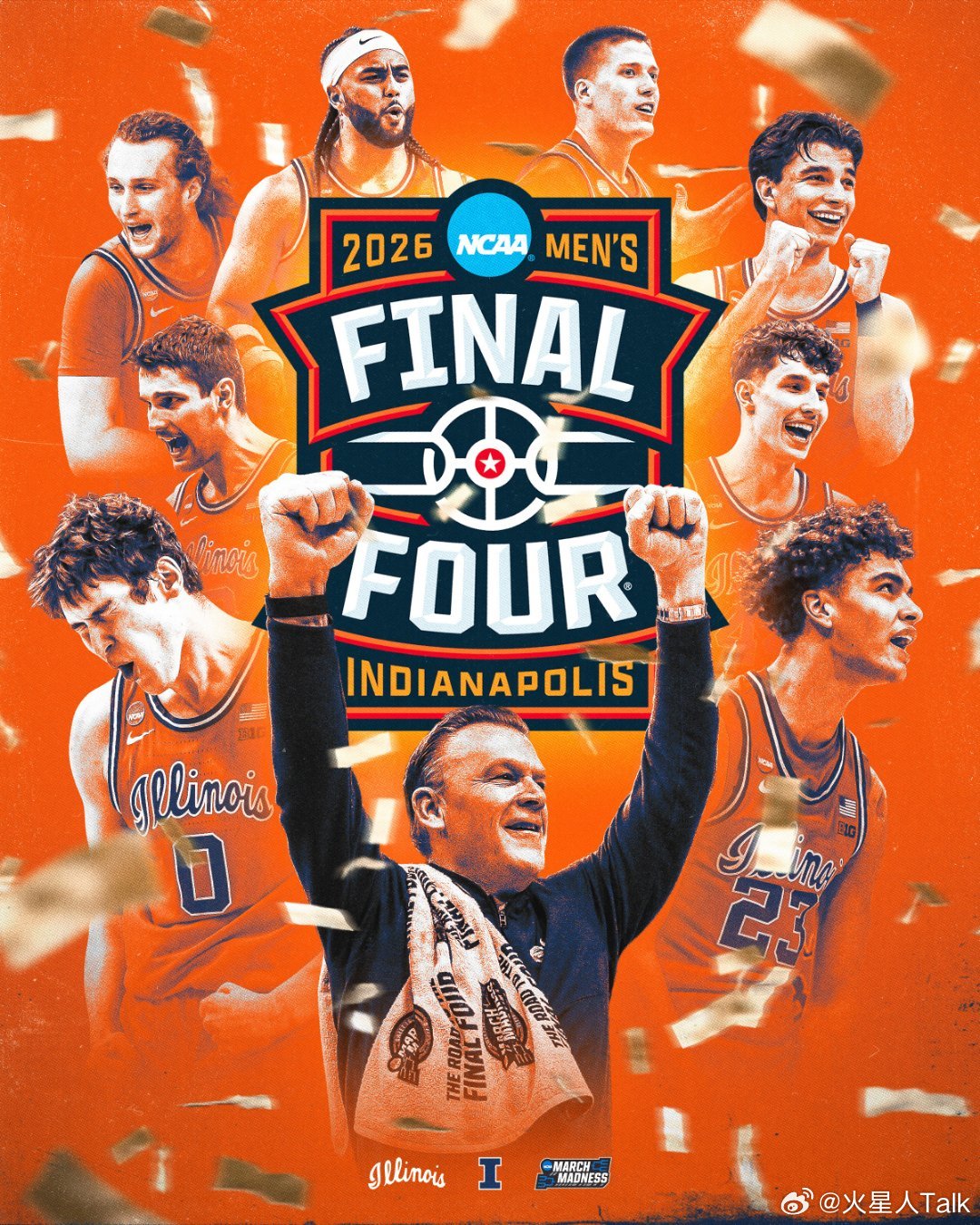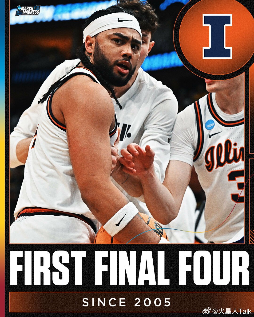 2025-2026赛季NCAA男篮疯狂三月 南区决赛伊利诺伊大学击败爱荷华大学,夺得南区冠军。校史第六次进入最终四强,自2005年以来首次。伊利诺伊人三分球命中率不足20%,但拥有内线的巨大优势,40比12堪称碾压。David Mirkovic9中3,9分12篮板。Keaton Wagler17中8,25分。Tomislav Ivisic11中6,13分。替补Andrej Stojakovic9中7,17分。鹰眼Bennett Stirtz17中8,24分。替补Tate Sage得到10分。其他登场六位队友合计得到25分。