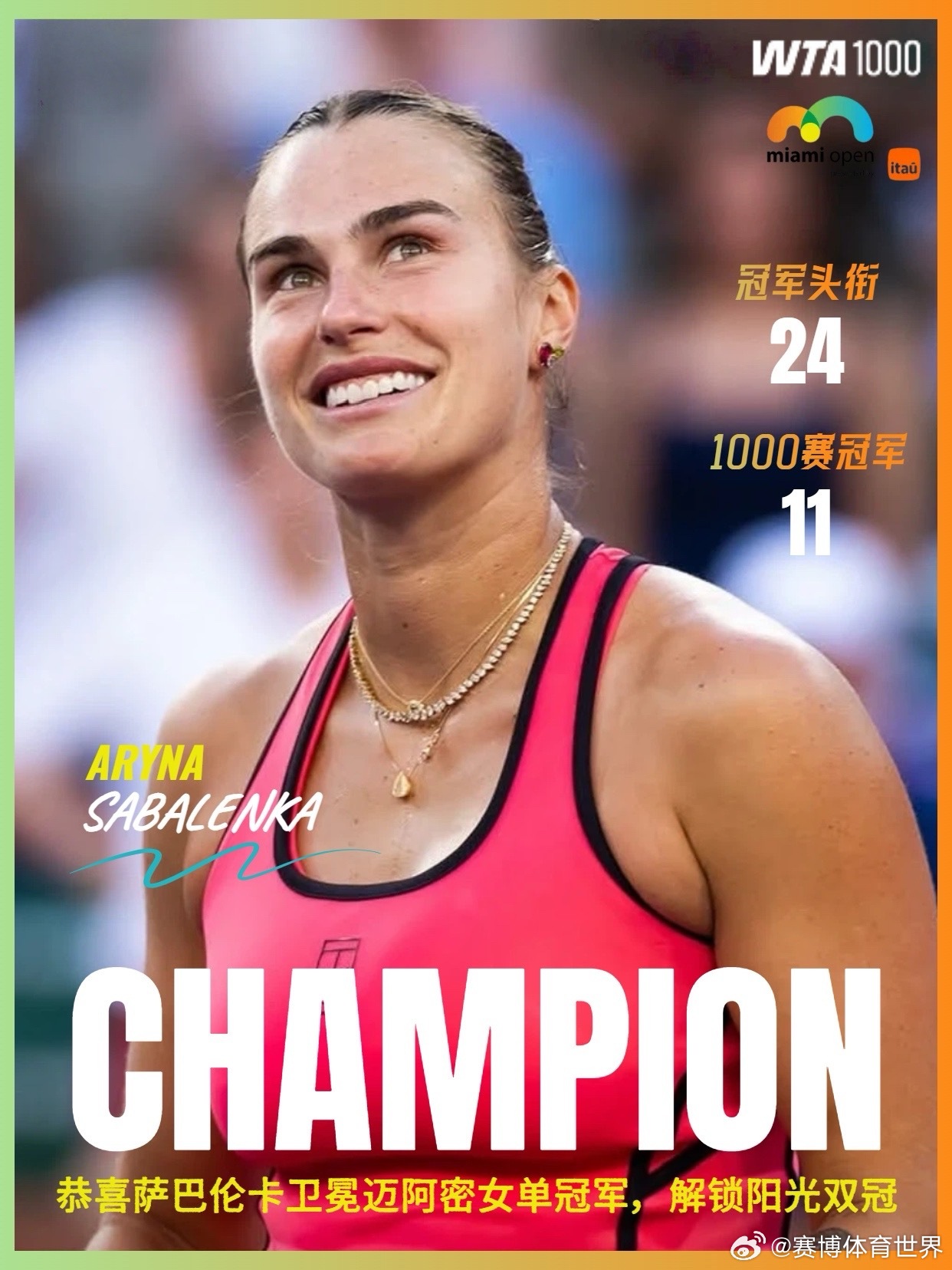 萨巴伦卡阳光双冠萨巴伦卡vs高芙 WTA1000迈阿密公开赛女单决赛,头号种子🇧🇾萨巴伦卡6-2 4-6 6-3战胜🇺🇸高芙,卫冕成功本站冠军,同时背靠背夺得印第安维尔斯站和迈阿密站女单冠军,成为第五位解锁阳光双冠的女子网球运动员!萨巴也解锁了本赛季第3冠、职业生涯第24冠,收获第11个1000赛冠军和$1,151,380奖金。🏆萨巴伦卡夺冠之路:R64:7-6(4) 6-4战胜🇺🇸李吉妮R32:6-4 6-2战胜🇺🇸麦克纳利R16:6-3 6-4战胜🇨🇳郑钦文[23]1/4决赛:6-4 6-4战胜🇺🇸巴蒂斯特半决赛:6-4 6-3战胜🇰🇿莱巴金娜决赛:6-2 4-6 6-战胜🇺🇸高芙