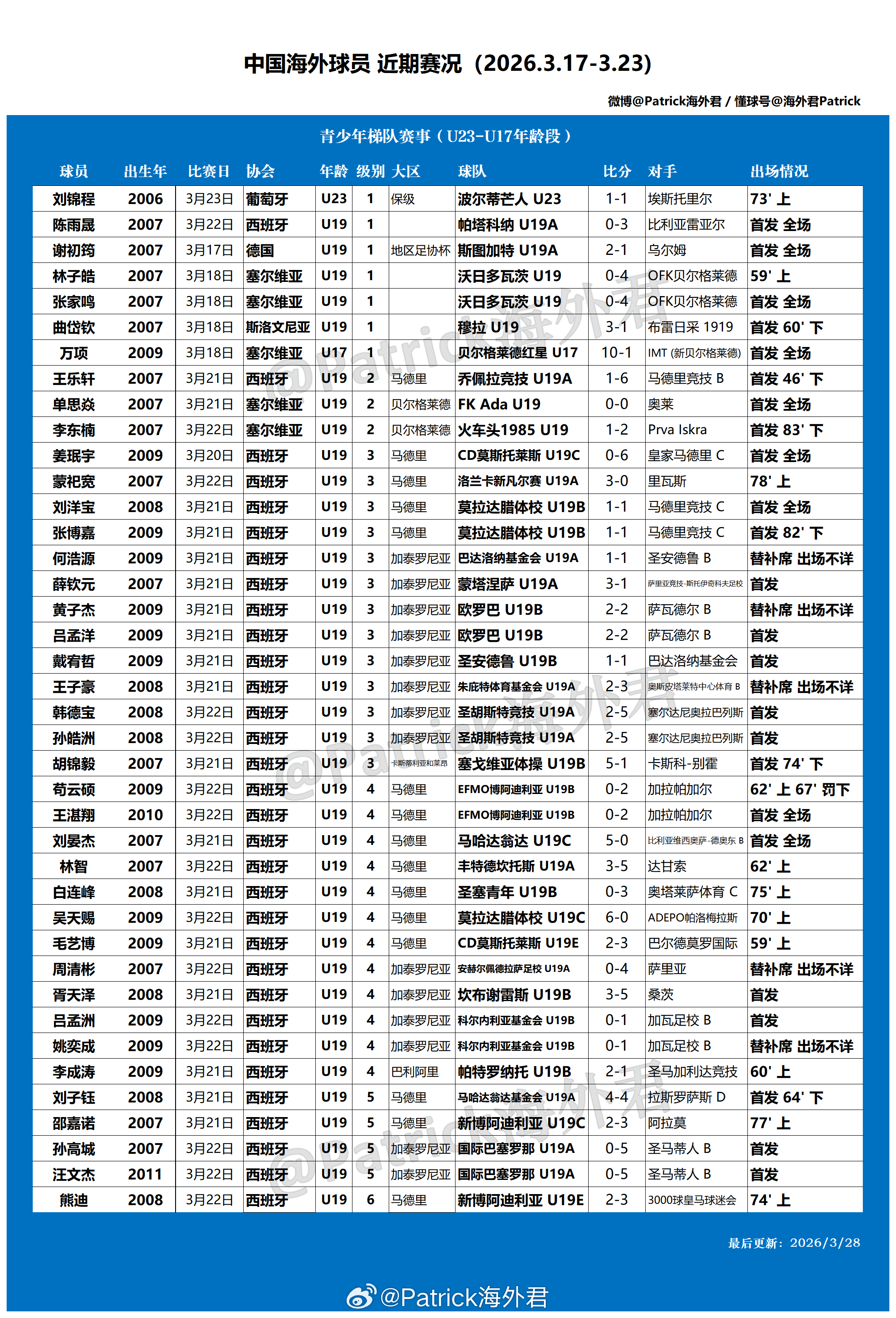留洋周报 海外球员比赛一览 (2026年3月17日-3月23日)