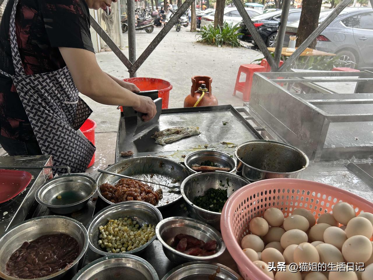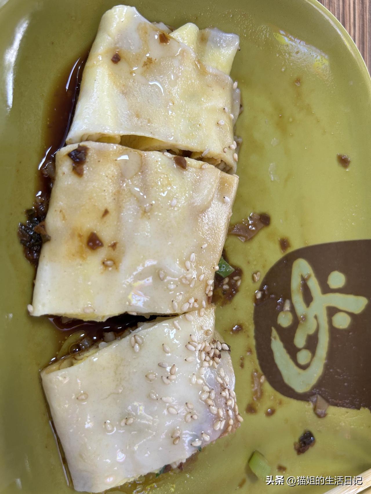 顺德6元一份的肉加蛋肠粉,算是把我吃撑了! 女儿住宿楼下很多小吃店,来吃的都是本地人!肠粉有很多价格,我也跟着前面的顾客点了一份肉加蛋肠粉!6元! 一勺米粉,一个鸡蛋,一点肉,老板动作极其流畅,5分钟搞定一份肠粉!再淋上酱汁,撒上芝麻,热气腾腾的一份肠粉就出炉了!其他辣椒,酸菜,榨菜丝这些自己加! 刚出炉的肠粉,米皮薄得透亮、软滑又带点韧劲,入口轻轻一抿就化开,完全不粘牙。 淋上的酱汁,咸鲜回甘,带着一点点甜香,不齁不淡,刚好提鲜。每一口都是软、滑、鲜、香,温热润口,吃完满嘴都是米香和酱油的鲜醇,清淡却越吃越香! 粤好吃肠粉 软滑肠粉