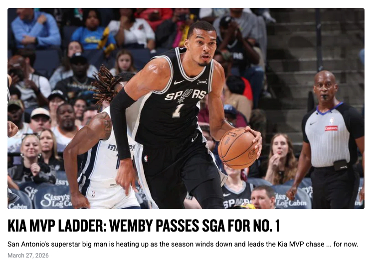 文班亚马反超亚历山大,成为最新MVP榜单第一!