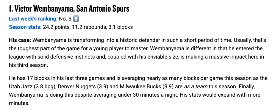 肖恩·鲍威尔给出的推荐理由是:文班亚马在极短的时间内就蜕变成为了一名历史级别的防守者。通常来说,防守是年轻球员在比赛中最难掌握的环节。但文班亚马与众不同,他在初入联盟时就展现出了扎实的防守本能,再配上他那令人艳羡的体型优势,仅仅在生涯的第三个赛季,他就在防守端产生了巨大的影响力。