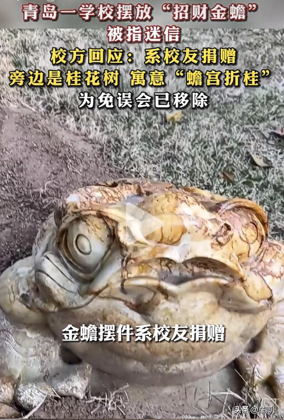 青岛校园一金蟾摆件被指迷信,无奈拆除!你眼里只有升官发财的粗俗,却不懂蟾宫折桂的美好祝福!网友:多读读书吧! 别用你的浅薄,糟蹋了美好的寓意! 真是离谱!青岛一所高中,就因为摆了个金蟾雕塑,居然被人揪着说是搞封建迷信,最后学校无奈直接把摆件拆了,看完真觉得又气又好笑! 事情很简单,有位李女士看到学校办公楼楼下摆的金蟾,背上有铜钱图案,还有招财进宝的字样,就一口咬定学校搞迷信、宣扬赚钱,还特意跑去爆料。 可人家学校明明是把金蟾放在桂树旁边,取的是蟾宫折桂的好寓意,就是盼着学校的学子们都能金榜题名、学业有成。 这件金蟾这是校友捐赠的、送给学弟学妹们的美好祝福,跟迷信半毛钱关系都没有! 就因为这人只盯着“招财进宝”四个字,完全看不懂校园里蟾宫折桂的文化寓意,揪着一点就乱扣迷信帽子,闹得舆论沸沸扬扬。 最后学校为了平息争议,只能乖乖把摆件移除。 就这样,李女士凭借一己之力,硬生生让学校的美好祝福被迫“低头”让路! 现在总有一些人,自己没文化、不懂传统寓意,但凡看到点吉祥摆件,就张口闭口封建迷信,拿着片面的认知乱带节奏。 学校本来是图个好彩头,为学生祈福。校友也是一心为学弟学妹送祝福,却要因为一句无端的指责,毁掉这份心意,实在太憋屈了! 如果真的想取招财进宝之意,学校怎会将其置于桂花树下?不是应该找个风水宝地、用香烛果品供起来吗? 好好的文化寓意,别再被无知和偏见糟蹋了,平常没事少刷点视频,多读点书吧! 大家觉得这事合理吗? 素材来源:澎湃新闻,侵联删!