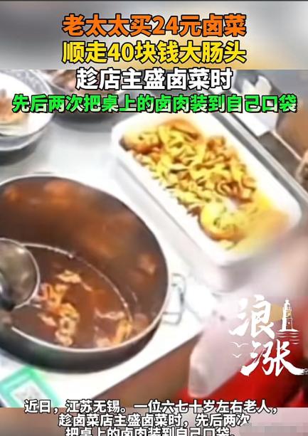 “丢人丢大发了!”江苏无锡,女子经营一家卤菜店,一日,她发现托盘里的卤大肠少了,她赶紧调取监控查看,这不看不知道一看吓一跳,一六七十岁老人,付款时,趁她不注意,先后两次偷偷将肥大肠装进自己的袋子里,动作行云流水,像拿自己家的一样顺畅。女子算了一下,老人共买了24元卤菜,拿走了40元的卤大肠。女子一气之下将视频发布到网上,让网友给评评理。网友:坏人都变老了! 事发当天,赖女士(化名)忙着招呼客人、切卤菜,一位看着慈眉善目的老人进店,挑了些卤菜,算下来一共 24 元,整个过程和普通顾客没两样,赖女士也没多留意。 老人付完钱,没立刻走,就站在柜台边,赖女士转身去给下一位顾客盛菜,余光里只觉得老人动了动,没往别处想。 等老人提着 24 元的卤菜走出店门,赖女士整理柜台时,一眼就看到托盘里的卤大肠少了两大块,心里咯噔一下,赶紧去调监控。 这一看,她整个人都懵了,监控画面里,老人付款后站在柜台前,趁她转身的间隙,第一次快速伸手,把一块卤大肠塞进随身的袋子里,动作快得几乎看不清,塞完还装作看其他卤菜的样子。 大概一分钟后,老人又瞅准赖女士低头切菜的空档,第二次伸手,又拿了一块卤大肠,同样麻利地塞进袋子,全程神情平静,眼神都没怎么躲闪,就像拿自己家的东西一样顺畅。 赖女士对着监控反复看了好几遍,越看越气,她算了算,老人买的卤菜才 24 元,顺走的两块卤大肠,按店里的售价,价值超过 40 元,相当于花 24 块钱,白拿了 40 多块的货,自己这单生意不仅没赚,还倒亏了不少。 她经营这家卤菜店,每天凌晨三四点就得起来备料,洗大肠、卤大肠,一套流程下来要七八个小时,这 40 多块的大肠,是她熬了大半天的心血,也是店里半天的利润。 越想越憋屈,赖女士没报警,一来觉得金额不算大,二来也想着老人年纪大了,不想把事情闹得太难看,但她实在咽不下这口气,就把监控视频剪好,发到了网上,想让网友评评理。 视频一发出,很快就引发了热议,不少网友看完都觉得离谱,有人直接评论 “坏人都变老了”,还有人说,年纪大不是贪小便宜的理由,这种小偷小摸的行为,丢的是自己的脸,也让整个老年群体跟着被非议。 有网友算了一笔账,卤菜店本就是小本生意,毛利不高,还要付房租、水电、食材成本,遇到这种顺手牵羊的顾客,对店主来说就是雪上加霜。 也有网友提到,现在不少小商铺都遇到过类似的事,老人仗着年纪大,觉得没人会较真,就频繁做这种小动作,其实不管年纪多大,偷东西就是不对,法律也不会因为年纪就豁免这种行为。 赖女士说,自己发视频不是为了网暴谁,就是想提醒同行,看店的时候多留意,也想让大家知道,小本生意赚的都是辛苦钱,别为了几十块的东西,丢了做人的底线。 这件事说到底,不是钱的问题,是规矩和人品的问题,几十块的卤大肠不贵,但丢了的脸面,可就捡不回来了。 那么,对于这件事,大家有什么看法?欢迎大家在评论区进行讨论。