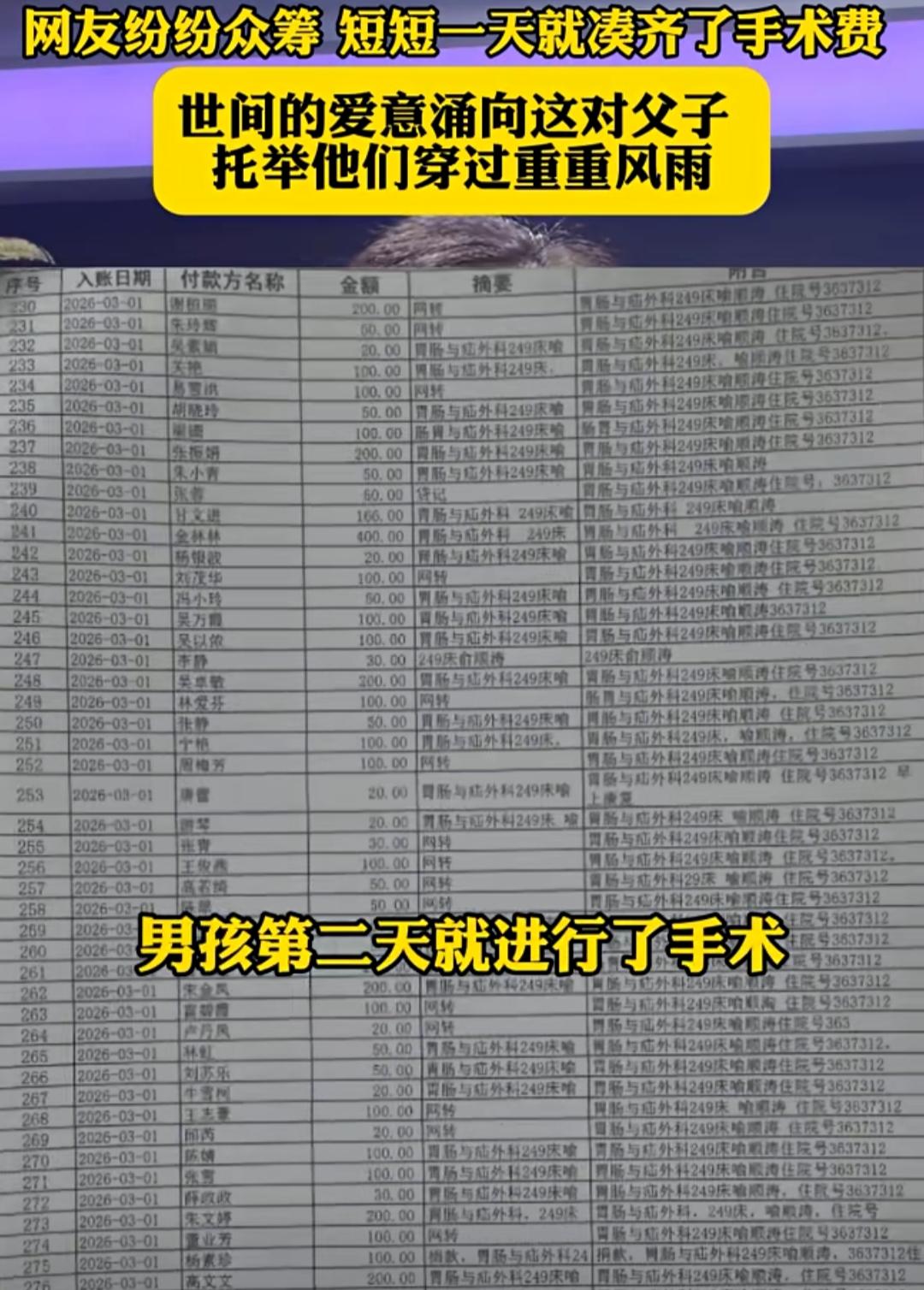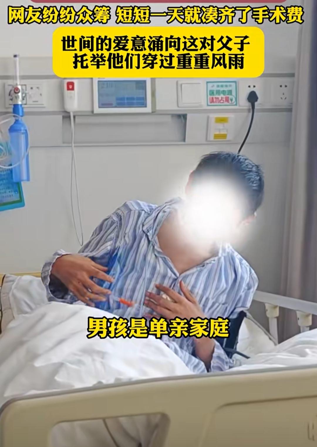 18岁的先天聋哑男孩躺在病床上,被病痛折磨了两天两夜,皮包骨的身体在病号服里显得格外单薄。他的父亲攥着缴费单,眼神里满是绝望高昂的手术费,让这个本就拮据的家庭只能选择保守治疗。 在医科大学第一附属医院的病房里,男孩无法用语言诉说痛苦,只能靠眼神传递无助。热心人将父子俩的困境发到网上,没想到一场跨越屏幕的爱心接力瞬间爆发。 无数陌生网友纷纷伸出援手,有人捐出几十元,有人凑上几百块,一句句“加油”“挺住”的留言,像暖流一样涌向这个沉默的家庭。 仅仅一天时间,手术费就凑齐了。当父亲得知这个消息时,这个沉默的汉子红了眼眶,他无法用语言表达感谢,只能对着镜头深深鞠躬。 网友们的善意,不仅托举着少年闯过生死关,更让我们看到:在这个世界上,总有人愿意为素不相识的人点亮一盏灯。 有人说,善意是会传递的。从热心人的探访,到网友的众筹,再到医院的救治,这场跨越地域的爱心接力,让我们相信:哪怕是微小的善意,汇聚起来也能成为托举生命的力量。 这个18岁的少年或许听不见世界的声音,但他一定能感受到,无数陌生人的爱意,正为他编织一张温暖的网,陪他穿过这场人生的风雨。生命接力暖人心