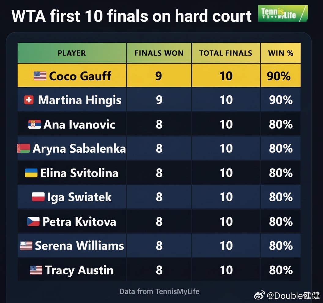 原来这是高芙第一次在硬地决赛输球!(之前9胜p负)不过前十个硬地决赛拿下9冠也排在第一位!(和辛吉斯并列第一)✅奥斯塔彭科 (林茨)✅ 马萨洛娃 (奥克兰)✅ 萨卡里 (华盛顿)✅ 穆霍娃 (辛辛那提)✅ 萨巴伦卡 (美网)✅ 斯维托丽娜 (奥克兰)✅ 穆霍娃 (北京)✅ 郑钦文 (总决赛)✅ 佩古拉 (武汉)❌ 萨巴伦卡 (迈阿密)萨巴伦卡卫冕迈阿密赛冠军萨巴伦卡阳光双冠wta
