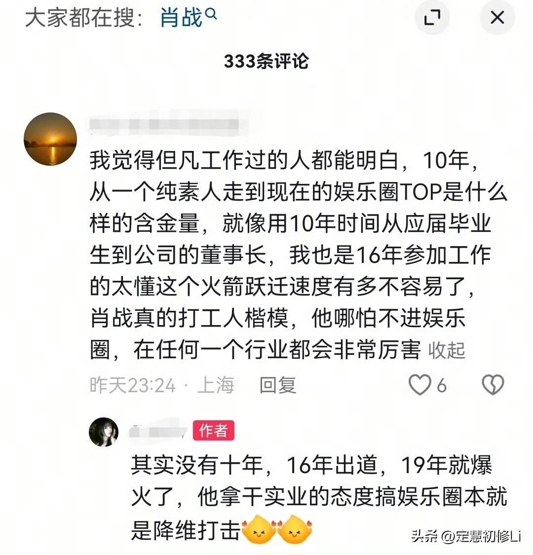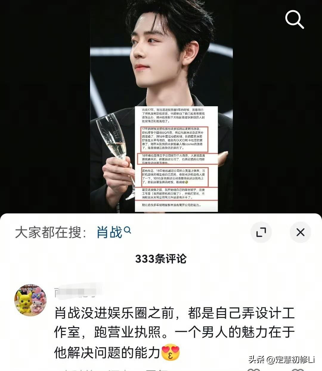 粉圈老跟肖战对标就很痛苦,肖战跟公司解约成立工作室,改名,拿到所有顶级资源,从没有在网上撕过,也从没有卖过一句惨,更没有影响作为演员的资源和工作(除了20年)。20年那么惨也只是说“变化就是剪了个短发”。所有的问题都是自己背后默默解决😖[比心] 干净坚韧强大的让所有人钦佩[赞]现在的一切都是肖战凭借自己默默积累的专业实力和业内口碑赢得的,肖战素人时期就有了足够的解决问题的能力,是能力和人品造就了今天的肖战这,这才是好运的来由