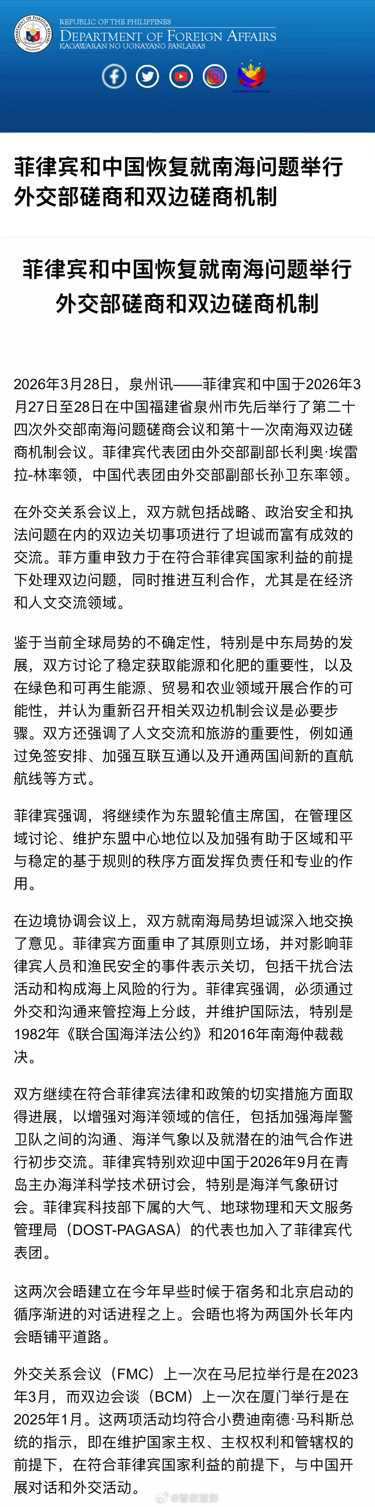 🇨🇳🇵🇭中菲南海问题双边磋商机制(BCM)第十一次会议,菲律宾外交部发布的新闻稿。菲律宾最新涉台表态菲律宾重申一个中国政策