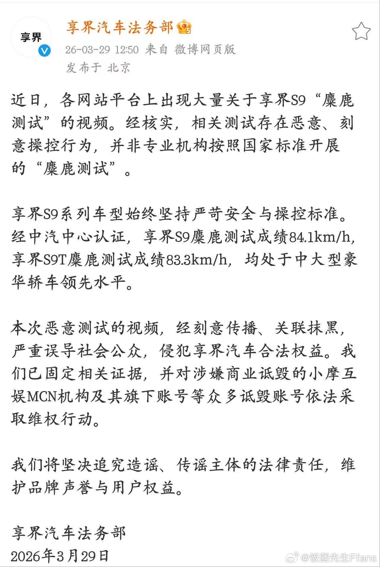 这次享界这次直接点名MCN、固定证据、启动法律追责,不跟你吵,直接走法律程序,动作还是干净利落的,当然,现在豪华品牌市场被新势力挤压的确实也挺严重...行业竞争当然没问题,但靠造谣抹黑,终究是赢不了市场的享界汽车法务部声明