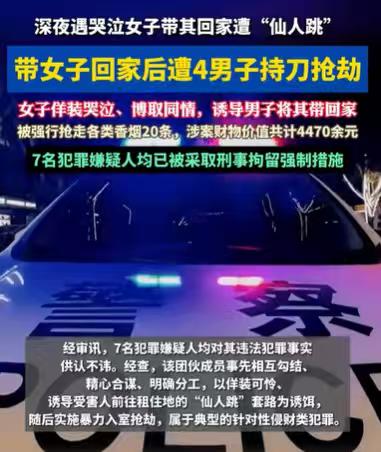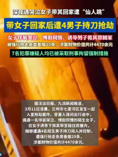 甘肃兰州,男子深夜外出,看到一个女子,可怜楚楚地在哭泣,实在让他心疼,他去关心女子,女子向他诉说着自己的心酸,想到男子家寻求安慰,男子可怜女子,把她带回家了,可男子还没有和女子好好相处,突然就撞进来4个壮汉,持刀抢了男子20条烟,一共抢了价值4000多元的东西。 没想到20多年的套路,居然被这个男子给碰到了,现在居然还有人,头脑简单,想到这样的套路,利用英雄救美人的心态,入室抢劫,真是让人愤怒又觉得可笑。 说起这件事,男子回过头来想了想,确实觉得这件事很简单,可他还是被套路了,他真的是后悔莫及。 当时夜深人静,男子睡不着,就在外面晃荡,远远的,他就听到一个女子的哭泣声。 心软的他,听不得女子的哭声,他一听到女子的哭声,就想着女子肯定是受到委屈了,或是被人欺负了,又或是被丈夫或者男朋友骂了,又或是遇到什么困难了。 他见不得女子委屈,也见不得女子有困难,就赶紧来到女子身边,想安慰女子。 他轻声细语,温柔地问女子怎么了,女子一看有人来关心自己,更是控制不住自己的情绪,眼泪像珠子般掉落。 她那水汪汪的大眼睛,蓄满了泪水,泪水一颗一颗地滚出来,看着就让人心生犹怜。 这么让人心疼的女子,男子一直陪在她身边,希望能给她些许温暖,走出困境,平复心情。 本就夜深人静,周围一片漆黑,一个女子在这里哭泣,也实在不安全,男子就想默默地保护着她。 他本想在这里陪女子度过这黑暗的夜晚,等天亮了,看着女子安然无恙地离开,他才能安心。 然而两人在交谈中,女子声声诉说着自己的困境,不停地暗示着要去男子家。 最终男子还是抵不住诱导,他决定帮女子,让她度过一个安全的晚上,他把女子带回家了,他就想着,女子待在他家,能够度过一个温暖的晚上。 他别无他想,女子进到他家,他就热情地招待女子,可两人屁股还没有捂热,突然就有4个男子闯进了男子家,手里拿着刀,进来就怒气冲冲,说男子欺负女子了。 男子还没有反应过来,这到底是怎么一回事,这4个壮汉就要他拿钱出来,把值钱的东西也拿出来。 可惜的是,现在谁还会把现金放在家里,男子就没放什么现金在家,唯一值钱的就是那20条烟了,最后这20条烟被抢走了,还有一些不太值钱的东西,一共被抢走了的东西,大概4000多元。 4个壮汉走了,女子也跟着他们走了,男子在家中,看着凌乱的家,回想起自己遇到的事情,他才恍然大悟,他遭遇仙人跳了。 难怪这名女子,怎么也要到他家来,原来就是为了这个目的。 男子意识到这一点,觉得自己想东西实在是太简单了,20年的套路,他居然信了,这才被抢走了4000多元的东西。 遇到这样的事,后悔莫及也没有用,他只能怪自己太心软了,明明一个女子,深夜来到一个男子家,稍微用心想一想,就可以知道这个女子不简单,肯定另有所图,要不然一个女子,怎么可能会轻信一个男子,而且胆子还那么大,随随便便就去一个男子家,这不正常。 可惜男子觉悟得太晚了,他的东西已经被抢走了,遇到这种事,他只能报了警。 男子遭遇的,很显然是典型的仙人跳,这是20年就经常出现的套路,被他遇到了,这几个人的行为当然已经构成了入室抢劫罪。 《刑法》第263条规定,以暴力、胁迫或者其他方法抢劫公私财物的,处三年以上十年以下有期徒刑,并处罚金;有入户抢劫的,处十年以上有期徒刑、无期徒刑或者死刑,并处罚金或者没收财产。 入室抢劫这是非常严重的情节,对这几个人应当给予严惩,民警经过调查,发现他们团伙一共有7个人嫌疑人,现在他们都被刑拘了。 遇到这样的事,还是要小心,男子不可轻易带女子回家。 那么对于男子所遇到的这件事,你有何看法呢?
