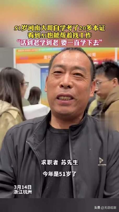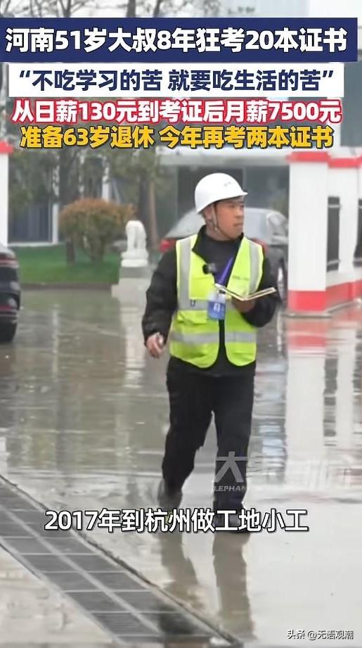 【活到老学到老:51岁大叔用8年20本证,改写人生】 43岁才下决心改变,晚吗?在河南打工人苏小锋这里,答案是:一点都不晚。 2017年,苏小锋从河南周口来到杭州,只有初中学历,没技能、没证书,只能在工地做小工,日薪130元,包住不包吃。搬一天水泥,手掌磨出血泡,工棚漏风,夜里冻得睡不着。他不想再吃没文化、没技能的苦,更不想让儿子因为学费辍学。 他咬咬牙,花200块买了电工书,白天搬砖,晚上在工棚里挑灯夜读,把知识点抄在硬纸壳上,揣在口袋里,吃饭、上厕所都拿出来看。第一次考电工证,他紧张到画错电路图,坐在考场门口掉眼泪,但他没放弃。 终于,他拿到了建筑电工证。这张证,直接把他的工资从日薪130,变成月薪7500元,还包吃包住。收入翻了几倍,他第一次真切感受到:知识和技能,真能改变命运。 尝到甜头,他更拼了。这一学,就是整整8年。白天在工地干活,晚上继续啃书;别人刷手机、打牌,他在刷题、备考。8年间,他拿下20本证书:电工、安全员、施工员、安全评价师、风险管理师……涵盖建筑领域多个岗位。 学历也没落下:从初中起步,一步步拿下中专、大专,2026年6月即将拿到土木工程本科毕业证。 如今51岁的苏小锋,早已不用在工地风吹日晒卖苦力。他成了工地安全巡检员,每天跑两三个工地,每次巡检仅3小时,工作体面、稳定、收入可观。 他说:“不吃学习的苦,就要吃生活的苦。”即便日子安稳,他也没停下:今年已经考了2本证,还计划再考两本,打算学到63岁再退休。 别再说“来不及”,人生没有太晚的开始 有人20多岁就躺平,觉得“努力没用”;有人40多岁才起步,却用坚持把人生翻盘。苏小锋的故事,最戳人的不是20本证,而是不认命、不服输、一直学的劲儿。 - 别被年龄困住:43岁开始,51岁逆袭,什么时候出发都不算晚 。 - 别被现状困住:从日薪130到体面工作,付出和收获永远成正比。 - 别被“躺平”困住:时代在变,不学习就会被淘汰;活到老学到老,人生才有奔头,生活才有惊喜。 苏小锋用行动证明:人生最好的投资,永远是投资自己。你现在吃的学习的苦,都会变成未来生活的甜。别等生活逼你吃苦,才想起要学习;别等年纪大了,才后悔年轻时没拼过。 从今天开始,哪怕每天学一点,坚持下去,你也能改写自己的人生。