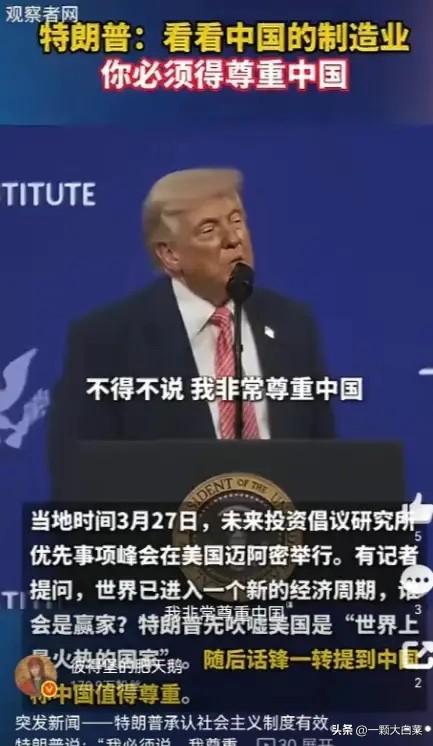 突发新闻——特朗普承认社会主义制度有效。 特朗普说:“我必须说,我尊重中国,因为这很不可思议,在一个理论上不应该奏效的体系下——你知道,我们上学,我们上最好的商学院,我们在这些学校表现很好,我们阅读关于自由创业的文章,我们阅读所有这些东西。 但看看中国,他们做得多么出色,产量多么惊人。我的意思是,他们生产的汽车如此之多,以至于他们之间甚至会比赛看谁能生产出最少的汽车,因为他们的汽车实在太多了。” 3月27日,在美国迈阿密举行的未来投资倡议研究所优先事项峰会上,面对记者提出的“世界进入新经济周期,谁会是赢家”的问题,特朗普在例行强调“美国是世界上最火热的国家”之后,话锋一转,用一段极其直白的表述,给了中国发展最直接的认可。 特朗普这番话可不是客套话,你得仔细琢磨里面的门道。一个以“美国优先”著称的总统,在公开场合如此直白地肯定中国的制度效能,这事儿本身就透着不寻常。他不是在说中国某个具体产品好,而是在承认一个“理论上不应该奏效的体系”取得了实实在在的成功。这种表述背后,藏着特朗普式的实用主义逻辑——结果比理论更重要。 看看他举的例子,汽车产业。这可不是随便挑的,中国汽车产量确实惊人。2024年,中国汽车产销双双突破3100万辆,连续16年稳居全球第一。更关键的是,新能源汽车年产销首次突破1000万辆,销量占比超过40%。特朗普那句“比赛看谁能生产出最少的汽车”虽然是夸张说法,但反映了一个现实:中国制造业的规模效应已经达到了让竞争对手感到压力的程度。 从专业角度看,特朗普的认可背后有三层含义。第一是承认中国制造业的硬实力,这不是靠补贴或者政策保护就能实现的,而是完整的产业链、高效的供应链管理和持续的技术创新共同作用的结果。第二是暗示美国传统经济理论的局限性,那些在商学院里学的自由市场理论,在面对中国这样的发展模式时,解释力明显不足。第三是为他接下来的对华政策做铺垫——既然承认你的实力,那么合作就比对抗更符合实际利益。 特朗普这个人向来以交易思维著称,他的称赞往往带着明确的目的性。就在这次峰会前后,中美双方正在就特朗普5月访华事宜进行沟通。这个时候公开肯定中国,既是为访问营造氛围,也是在向国内展示他的外交手腕——看,连中国这样的竞争对手都尊重我。 但咱们也得清醒,特朗普的称赞不等于美国对华政策的根本转变。他可以在一个场合肯定中国的成就,转身就可能在其他领域施加压力。这种矛盾恰恰反映了当前中美关系的复杂性:既有竞争,也有合作;既有分歧,也有共同利益。 从中国经济实际来看,2025年GDP总量突破140万亿元,社会消费品零售总额超过50万亿元。汽车产业只是中国制造业升级的一个缩影,背后是科技创新能力的整体提升。世界知识产权组织数据显示,中国创新指数排名首次进入全球前十。这才是中国发展的底气所在。 特朗普的这番话,与其说是对中国制度的认可,不如说是对发展实效的低头。在全球化深入发展的今天,任何理论都要接受实践的检验。中国用几十年时间走完了发达国家几百年走过的工业化历程,这种发展速度和质量,确实超出了传统西方经济理论的解释范围。 未来中美经济关系会怎么走?大概率是竞争与合作并存。特朗普的实用主义决定了,只要对中国发展有利的事情,他可能会选择合作;但只要触及美国核心利益,竞争的一面就会凸显。对中国来说,关键还是做好自己的事情,持续推动产业升级和技术创新,用实实在在的发展成果赢得尊重。 各位读者你们怎么看?欢迎在评论区讨论。