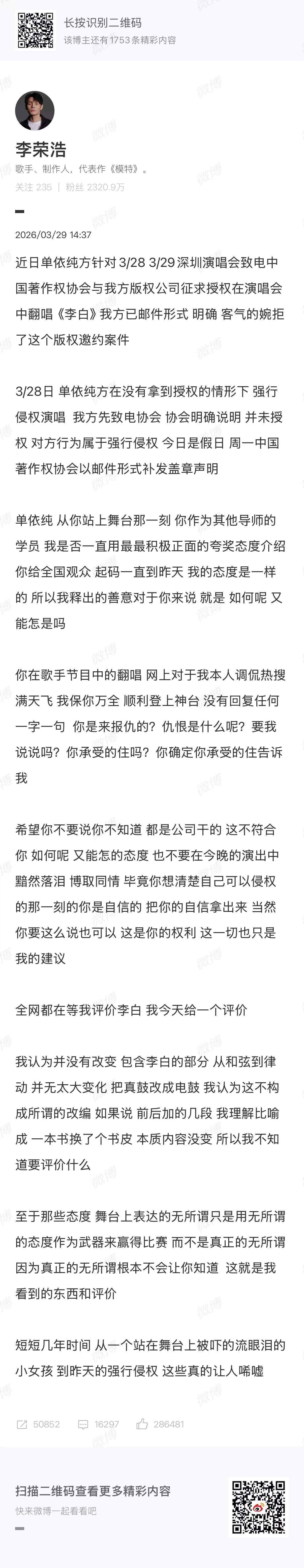 #李荣浩 单依纯强行侵权# 3月29日,李荣浩喊话单依纯,称其在未经其授权的情况下在深圳演唱会强行翻唱《李白》,属于强行侵权行为,周一中国著作权协将以邮件形式补发盖章声明。