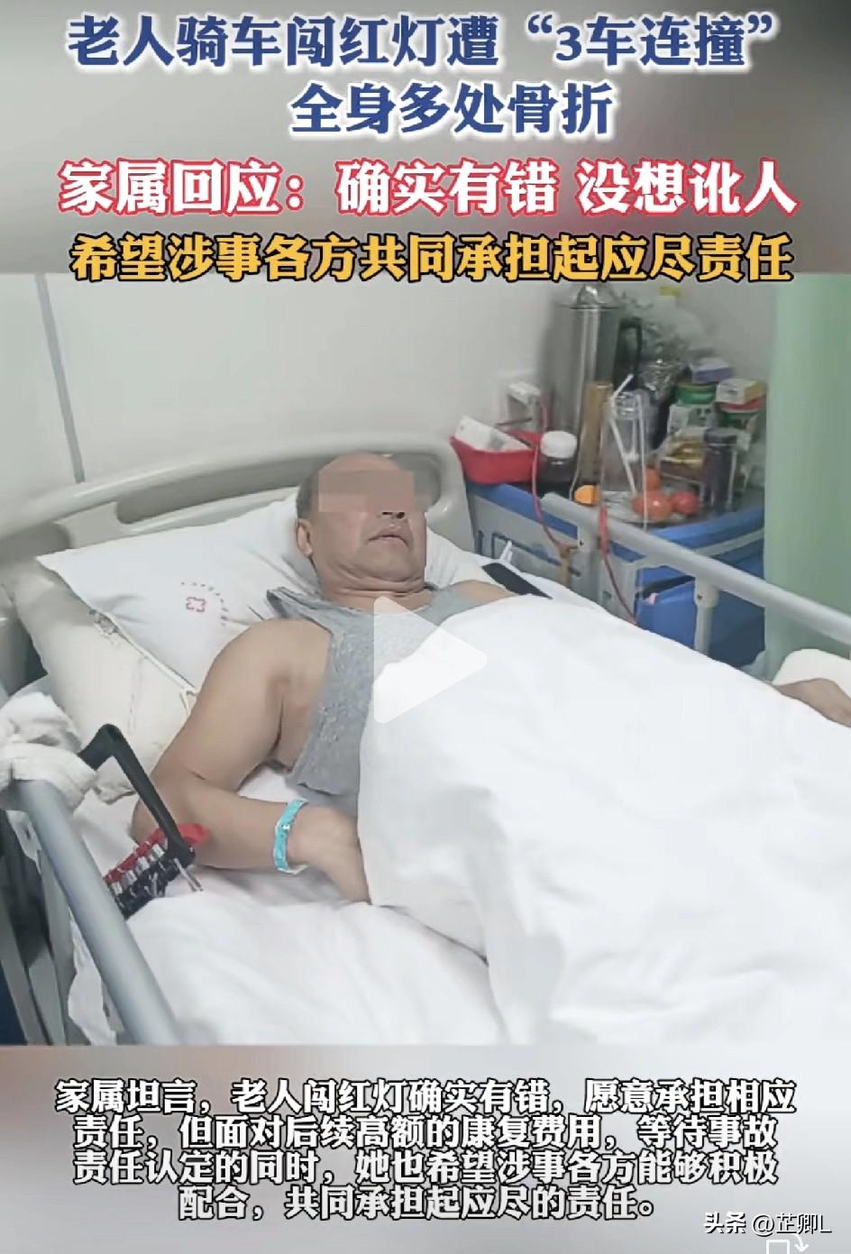 大连67岁老人闯红灯遭三车连撞,家属表态不讹人,只希望各方主动担责!网友却吵翻了天! 3月1日中午,大连甘井子区中华路和月牙泉路交叉口附近,发生了一起让人揪心的车祸! 67岁潘大爷骑车闯红灯,先是被第一辆车撞倒,当时老人大概是被吓懵了,脑子一片空白,慌里慌张又继续往前骑。 结果又接连被第二、第三辆车撞上,惨遭三车连撞,伤势特别严重。 医院诊断结果看着都疼:股骨粉碎性骨折,腰椎、肋骨、耻骨、鼻骨等全身多处骨折,还有一身的外伤。 老人的手术已经完成,截止目前光医药费就花了将近7万块,后续康复还要花一大笔钱。 大爷女儿潘女士直接坦言:父亲闯红灯肯定是错的,我们该担的责任绝不推脱,从来没想过讹人! 目前,大爷被撞后,记忆有些模糊,只记得第一起事故的细节,而后续康复的费用很高。 好在家属已经陆续收到了三台车的交强险赔付,目前就等着交警出具事故责任认定。潘女士希望涉事各方都能积极配合,该担的责任担起来,一起解决老人后续的治疗问题。 网友却是吵翻了天: “闯红灯就是闯红灯,全责,让别人承担是不可能的,法律面前人人平等,不是年领大了就没责了!” “自己负全责!!!成年人应该为自己的行为买单!” “自己的错。凭什么要别人承担责任?” “第一辆车撞完人直接离开,也实在不妥。” 一边是老人违规闯红灯在先,这是不争的事实。一边是家属明确表态不耍赖,只求主动担责。 这起事故的责任到底该怎么分才公平?全网都在等待一个公平的事故认定。 大家怎么看?欢迎评论区聊聊! 素材来源:逐浪新闻,侵联删!
