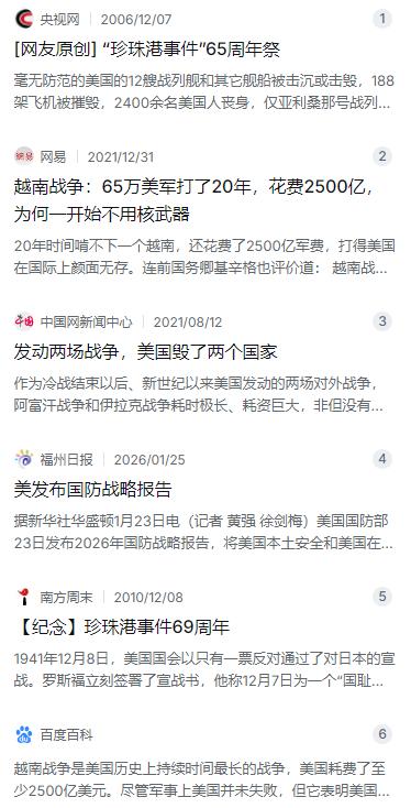 不攻打美国本土,战争或许会逐步升级;而一旦打击美国本土,战争极有可能即刻停止。这句话听着有点颠覆常识,其实一针扎在了美国霸权的最软肋上。 麻烦看官老爷们右上角点击一下“关注”,方便您进行讨论和分享,感谢您的支持! 这句话乍听起来确实有点反常识。一般人总觉得,战争嘛,就是两边往死里打,谁先扛不住谁就输。可放到美国这个国家身上,逻辑还真不太一样。说白了,美国这架战争机器,有个特别明显的“死穴”——它的本土。只要本土不挨打,它能跟你耗上十年二十年不带眨眼的;可一旦本土真的挨了揍,它反而会立刻集中所有火力解决眼前的威胁,至于海外那些烂摊子,说放下就放下。 先看看1941年那个冬天,日本人在珍珠港干的那一票。那会儿美国国内孤立主义情绪浓得很,大部分老百姓觉得欧洲打仗是欧洲的事,跟咱没关系。结果1941年12月7日早上,日本人的飞机直接给夏威夷来了个“叫醒服务”。那天死了2400多号美军,光亚利桑那号战列舰一艘船上就沉了上千人,太平洋舰队差点被一锅端。这一下可捅了马蜂窝了,前一天还在琢磨着怎么不参战呢,第二天罗斯福就跑到国会喊出了“国耻日”这三个字,全美国上下拧成一股绳,对日宣战,立马就干上了。你看,本土(包括海外领地)一挨打,美国人连犹豫都不带犹豫的,直接全力开火。 可到了越南战争那会儿,情况就完全不一样了。从1955年一直拖到1975年,打了整整20年,换了5个总统,投入的兵力高峰时超过65万,钱更是花了至少2500亿美元。为啥能拖这么久?说白了,那场仗从头到尾都没烧到美国本土。美国人自己在国内该吃吃该喝喝,虽然电视上天天播着战场画面,老百姓也上街反战,可毕竟子弹没打到自己家窗户上,政府就有足够的理由和空间慢慢耗。那时候美国在越南打得再憋屈,也不敢把战火烧到北纬17度线以北太远的地方,就是怕中国和苏联直接下场,把事儿闹大。这种“有限战争”的打法,恰恰说明只要本土安全没受到直接威胁,美国政府就能顶着压力继续耗。 再看2001年的“9·11”,这事儿比珍珠港还狠,直接撞在了纽约世贸中心和五角大楼上,近3000条人命没了。这已经不是打仗了,这是在本土心脏上捅刀子。小布什当时什么反应?二话不说,直接发动阿富汗战争,目标就一个——灭了基地组织,推翻塔利班政权。那会儿美国人的想法很简单:谁敢动咱家,咱就干谁。这时候谁还管什么国际舆论、什么战争成本啊,国家安全都受到挑战了,那就一个字:打。 可阿富汗这场仗,一打就是20年。到后来美国人算了一笔账,直接投入的钱超过2.3万亿美元,阵亡的士兵也有2400多人。这钱花得跟流水似的,人也搭进去不少,为啥能打这么久?关键原因跟越战一样——仗是在别人家打的,美国本土始终是安全的。哪怕塔利班再厉害,也没法把战火引到纽约或者华盛顿。只要本土没事,美国政府就能一边喊着“反恐”,一边继续往里头砸钱、填人,哪怕明知道这是个泥潭,也能咬着牙耗上20年。 其实美国人心里门儿清,啥叫真正的“生死攸关”。2026年1月刚发布的国防战略报告,白纸黑字写得明明白白:保卫美国本土安全,是头等大事,比啥都重要。这份报告把“本土安全”和“西半球的利益”捆在一起,强调要确保从北极到南美洲的关键地区都捏在自己手里。换句话说,在美国的战略里,海外那些盟友也好、基地也罢,能分担就分担,但本土这条底线谁都不能碰。一旦本土真的挨了打,甭管你在中东、亚太打得怎么样,美国政府都得立刻调转枪口,把全部精力拉回来处理家门口的事。 所以说,那句话看着颠覆,其实说得挺透。不管是珍珠港挨炸、越南泥潭、还是“9·11”后的反恐战争,再到阿富汗的20年消耗,美国人用这几十年时间反复验证了一个道理:本土安全才是真正的“软肋”。一旦这地方被戳中,所有海外战场的账都得先放一边;可要是这地方一直没事,那它就能顶着巨大的代价跟你慢慢耗。这就是美国这个超级大国最真实的逻辑——能打的仗,未必是能输得起的仗;最怕的,其实是自家的“后院”着火。