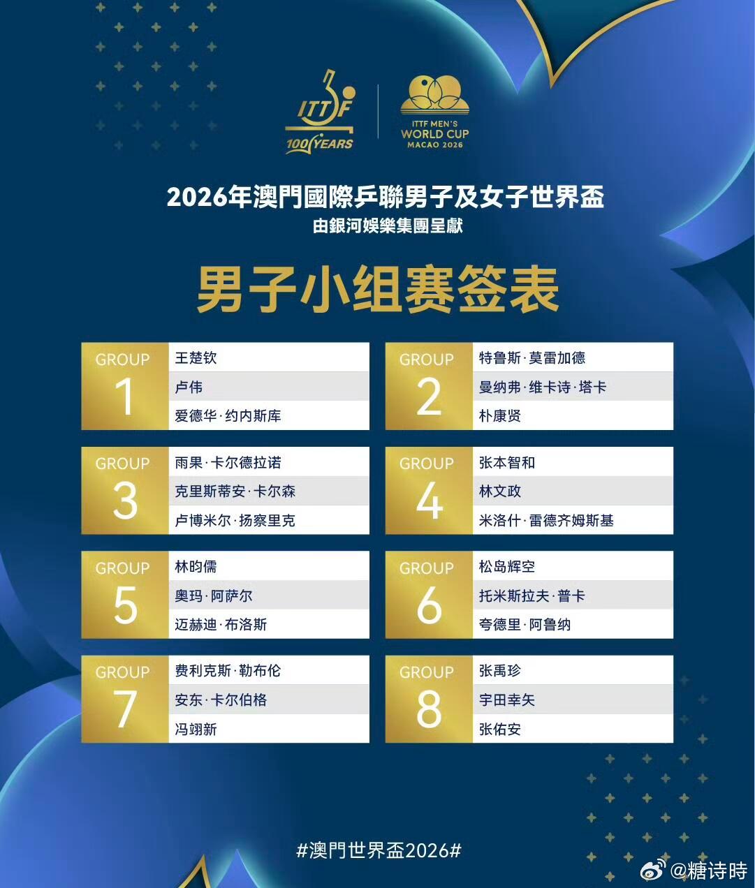 【Group 1】王楚钦🇨🇳、卢伟🇦🇺、爱德华·约内斯库🇷🇴【Group 2】特鲁斯·莫雷加德🇸🇪、曼纳弗·维卡诗·塔卡🇮🇳、朴康贤🇰🇷【Group 3】雨果·卡尔德拉诺🇧🇷、克里斯蒂安·卡尔森🇸🇪、卢博米尔·扬察里克🇨🇿【Group 4】张本智和🇯🇵、林文政🇦🇺、米洛什·雷德齐姆斯基🇵🇱