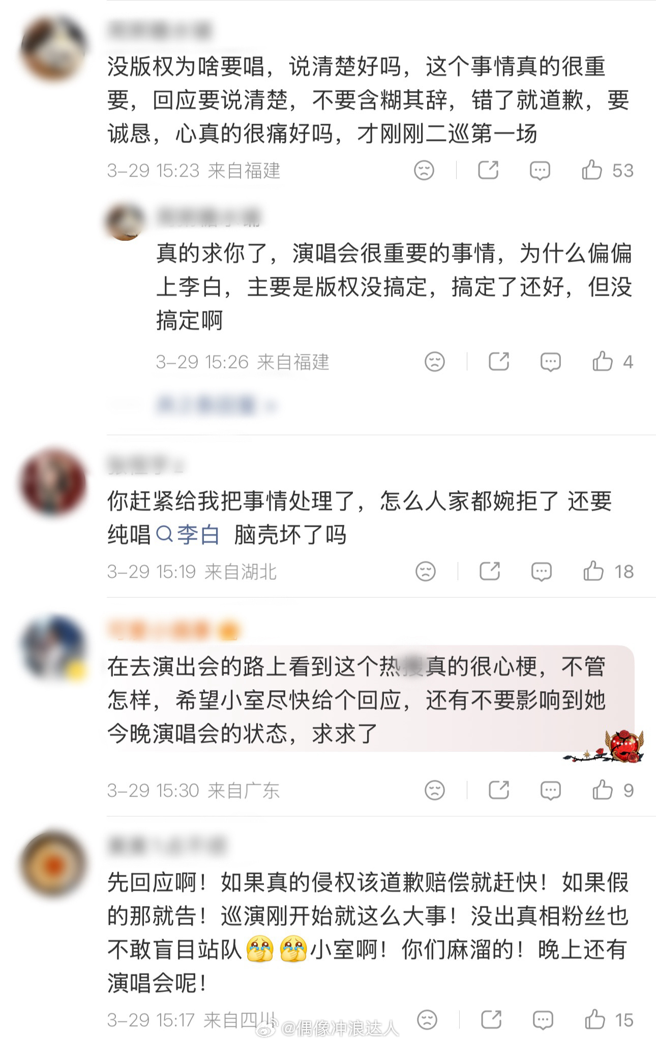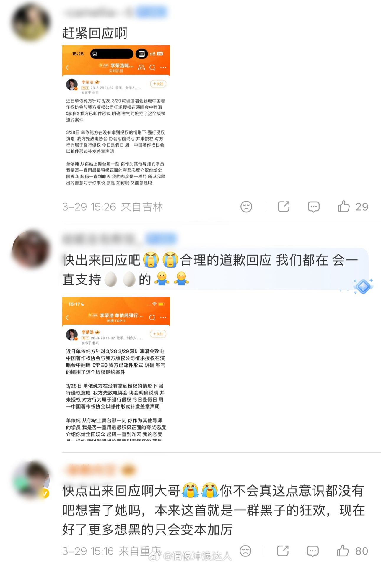 单依纯工作室评论区现状:粉丝让工作室出来回应和道歉赔偿,没给版权就不要唱,本本分