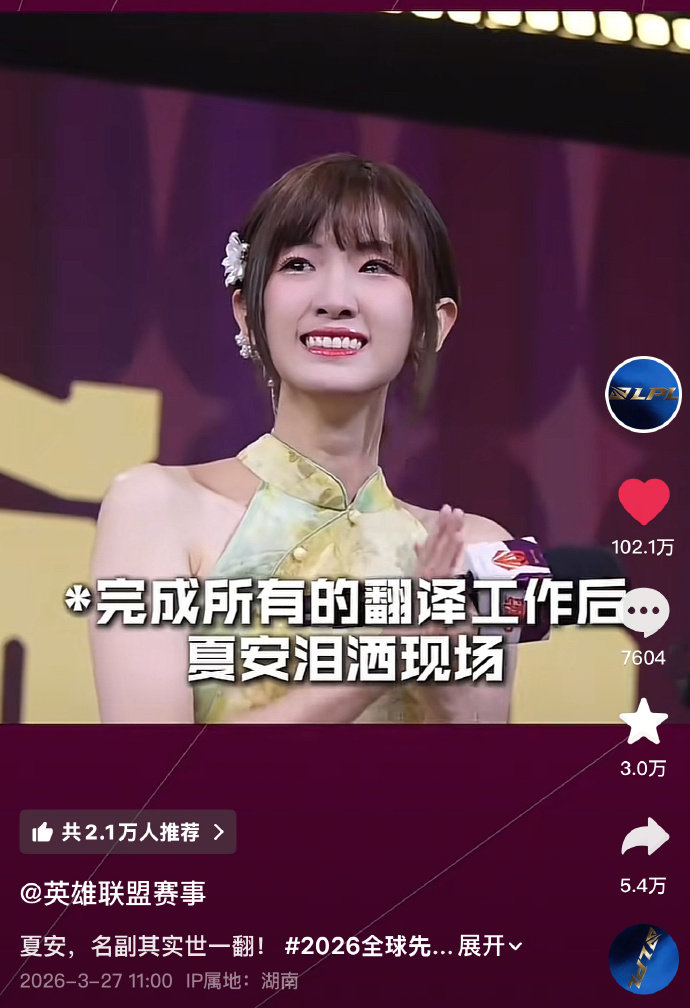 夏安世一翻百万点赞夏安翻译视频破百万 英雄联盟S16