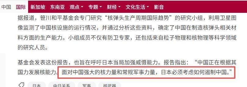 俄罗斯曾发出警告:如果中国现在一直盯着日本,那么中日战争没有开始,中国就输掉一半了。谁能想到,就在日本军官持刀闯入咱们大使馆的风波还没平息时,日本智库又抛出了一份极其诡异的报告! 这份报告字里行间透着一股酸到极致的嫉妒,直接把矛头对准了咱们的核家底。 话说回来,这可不是什么地摊文学。它出自日本笹川财团的所谓“精英团队”,撰写者是东京大学副教授小泉裕。 这人可是个响当当的“反华专业户”,常年拿着日本右翼势力的真金白银,专门搞一些渲染威胁的把戏。 报告里信誓旦旦地说,中国正以惊人的速度赶超美俄,预计在2035年前就能部署足足2000枚核弹头。 不仅如此,他们还弄得像亲眼看见了一样。声称通过卫星图像监测了甘肃和四川的石墨反应堆,连“钚提取后处理厂”的细节都敢编排。 最后图穷匕见,直接甩出一句:面对中国强大的核力量,日本必须考虑如何遏制!这摆明了就是得寸进尺,硬往咱们头上扣屎盆子。 看着他们煞有介事的推算,真是让人唏嘘不已。他们把民用核设施的原料生产能力,生硬地等同于军用核潜力和弹头制造量。 这种无视严格核材料管控体系、模糊军民界限的偷换概念,在内行人眼里简直是滑天下之大稽。 要知道,在冰冷的军工数据面前,谎言是不攻自破的。根据瑞典斯德哥尔摩国际和平研究所发布的权威数据,咱们当前的核弹头数量约为600枚。 这个数字,仅仅是美国的八分之一、俄罗斯的九分之一。哪怕是向来喜欢夸大其词的美国国防部,在《中国军力报告》中对2035年的预测,也就是1500枚左右。 日本这家智库倒好,大笔一挥直接拔高了三分之一。真以为造核武器是菜市场买白菜呢? 咱们外交部早就硬气表态,中国始终坚持自卫防御核战略,把核力量维持在国家安全需要的最低水平。咱们不搞军备竞赛,每一步都保持着极大的克制。 日本这波“贼喊捉贼”的操作,更是绝了。一边指着咱们的600枚核弹头大做文章,一边自己却在本土暗度陈仓。 大家可能不知道,日本目前足足囤积了超过40吨的钚!这可是实打实的武器级核材料,足够造出6000多枚核弹头。 全球最大的武器级核材料囤积国,居然天天在国际上装可怜、喊委屈,这双标玩得简直令人作呕。 一来二去,日本的底牌早就漏光了。在这个节骨眼抛出报告,根本不是什么学术研究,就是为了给扩军修宪找个“正当”的借口。 高市早苗政府上台后,日本防卫费连续飙升,直接突破GDP的2%,彻底撕毁了战后长期坚守的1%红线。 想要让国内老百姓捏着鼻子掏这笔巨额军费,就必须制造一个足够惊悚的“外部假想敌”。这虚构出来的2000枚核弹头,就是为了精准煽动民众的安全焦虑。 其次,这也是为了转移日本国内矛盾的视线,凝聚右翼基本盘。更阴险的是,他们想用这套说辞倒逼美国。 通过把咱们描绘成“即将超越美俄”的怪物,让美国感受到压力,从而提供更明确的核保护伞,甚至推动危险的“核共享”。 日本这几年不断在西南群岛部署导弹,把12式导弹射程从一二百公里硬拉到1000公里,火力覆盖咱们东南沿海。 他们所有的野心都指向进攻性能力的大爆发,对标介入台海做实战化准备的意图昭然若揭。 这种吃不到葡萄说葡萄酸的碰瓷把戏,终究是上不了台面的。在绝对的实力碾压和四两拨千斤的战略定力面前,任何跳梁小丑的狂吠,都阻挡不了大国崛起的步伐。