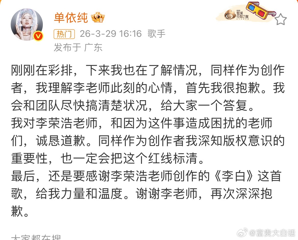 单依纯道歉 彩排后紧急回应,向李荣浩诚恳认错。作为创作者才想起版权红线?早干嘛了。不过态度还算端正,看后续行动吧。李白李荣浩单依纯