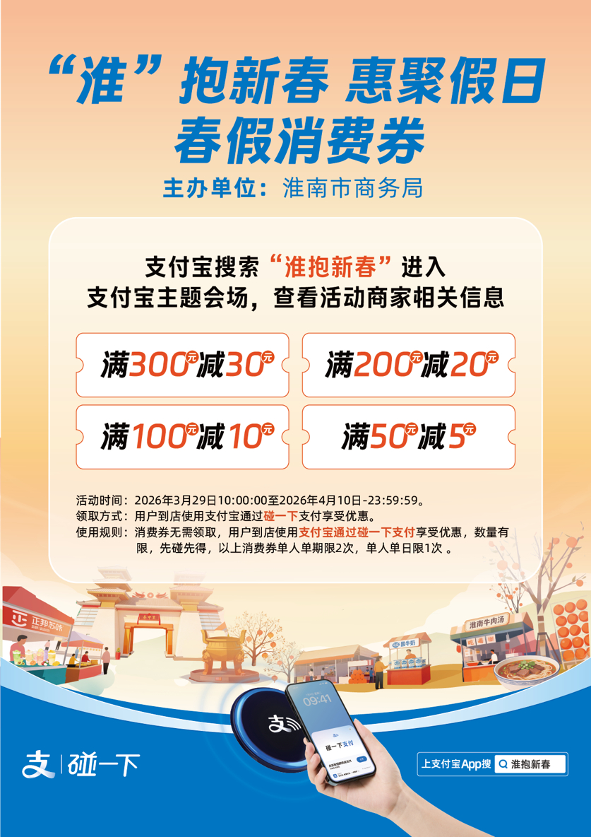 【#全国首个即碰即用春假消费券上线#】3月29日下午,由淮南市商务局、淮南市文旅局联合蚂蚁集团共同主办的“碰”见淮南烟火 支付“码”上有福——淮南市支付宝人气城市暨共创数智新消费街区启动仪式举行。当天,全国首个“即碰即用”春假消费券正式上线。与传统领券模式不同,这一新模式依托支付宝的“碰一下”支付技术,重构了消费场景。本次消费券发放额度超过100万元,用户只需解锁手机轻触商家的收银设备,即可在支付瞬间自动核销优惠。通过科技手段有效激发春假假期消费活力,为市民和游客带来前所未有的便捷体验。“这次活动,既是安徽推动春假经济的一次创新尝试,也是数字便民服务走进日常生活的生动体现”,淮南市商务局局长孙道军表示。(记者 陈丽卿)