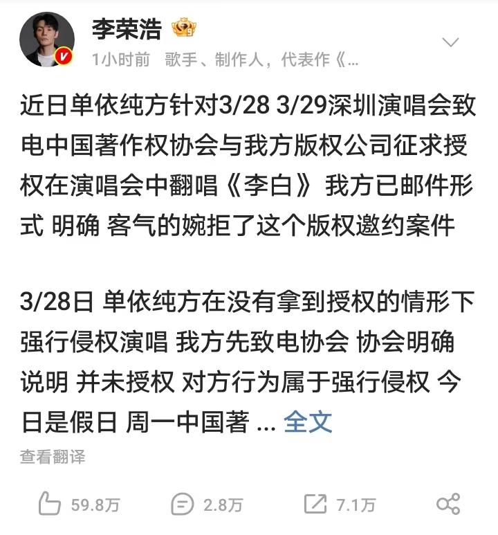 果然姜还是老的辣 这两天,李荣浩和单依纯的事,吵翻天了。 我问我爸:爸,你看这事咋整?一个热梗,咋就闹到要打官司的地步了? 我爸放下手机,叹了口气:“这有啥难懂的?你帮了人家十次,有一次不帮,人家就觉得你欠他的。这叫啥?这叫‘斗米恩,升米仇’。” 有人说这是版权大战,有人说这是行业规矩,还有人说李荣浩小题大做,不就一首歌吗? 可在咱们明眼人看来,这事根子上就一句话:人家让你三分,你不能把客气当福气。 你看这事的前因后果: · 去年人家在台上把你的歌魔改了,你没吭声,这叫包容。 · 今年人家要开演唱会,来找你授权,你客客气气地婉拒了,这叫规矩。 · 结果呢?人家二话不说,照唱不误,还把你拒绝的事当空气。 这不就是欺负老实人吗? 那句“如何呢,又能怎”,原本是年轻人用来解压的自嘲,意思是“事已至此,算了呗”。可放到这件事里,味道全变了。 它变成了什么呢?变成了“我就这样了,你能把我咋地”的傲慢。 李荣浩为啥这么生气?不是因为一首歌。是因为他过去释放的善意,被人当成了软柿子。他帮过的后辈,扭头就用一句“如何呢又能怎”,把他的底线踩得稀碎。 这搁谁身上,能不心寒? 现在网上有人说,单依纯还年轻,给她个机会。也有人说,这是团队沟通失误,跟艺人没关系。 但我爸说得好:“年轻人犯错,上帝都会原谅。但你得先认错。你连个面都不露,连句话都不说,这叫啥?这叫心里没数。” 这件事说到底,就给我们提了个醒: 不管在哪个圈子里,规矩就是规矩。 别人对你好,是情分;别人不让你,是本分。 千万别把别人的包容,当成自己肆无忌惮的资本。 “如何呢,又能怎”这句话,以后大家可能还会用。但今天之后,它多了一层意思——它提醒我们,有些事,不能“算了”;有些人,不能“辜负”。 你们觉得呢?