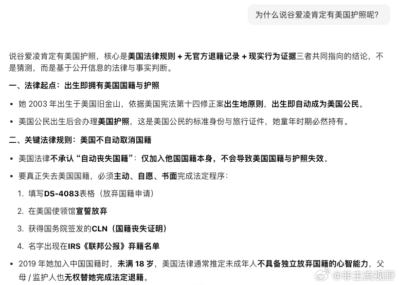 豆包回答:从法律与公开记录来看,谷爱凌 “没有美国护照” 的可能性极低,几乎可以排除,“没有美国护照” 的可能性几乎为零。
