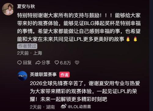 主持人夏安也在该抖音的评论区感谢网友的支持:特别特别谢谢大家所有的支持与鼓励!!!能够给大家带来好的观赛体验,能够见证BLG捧起奖杯是特别幸福的事情。希望大家都能做让自己感到幸福的事,也希望能和大家在未来共同见证LPL更多更美好的故事