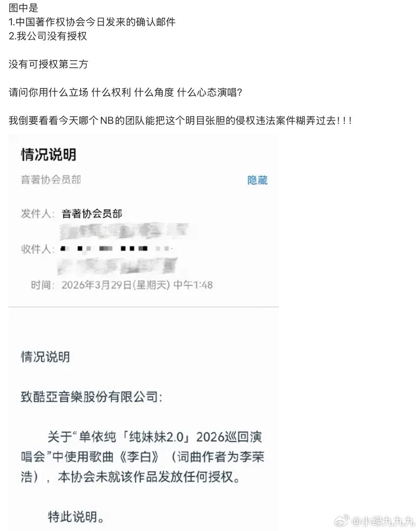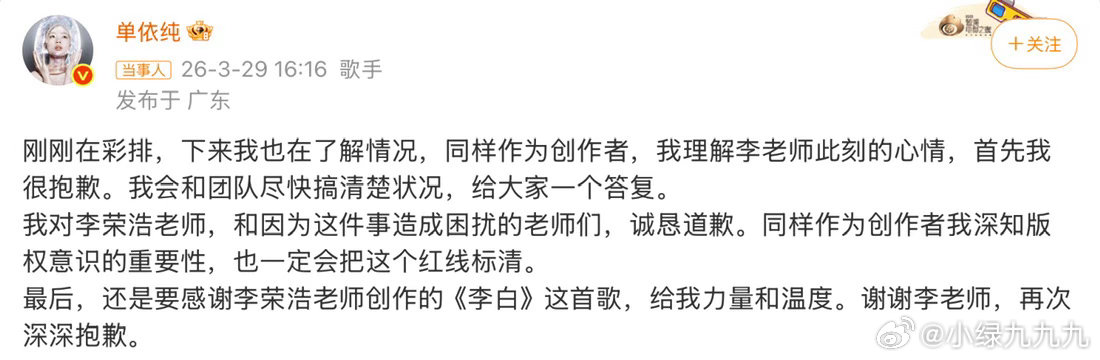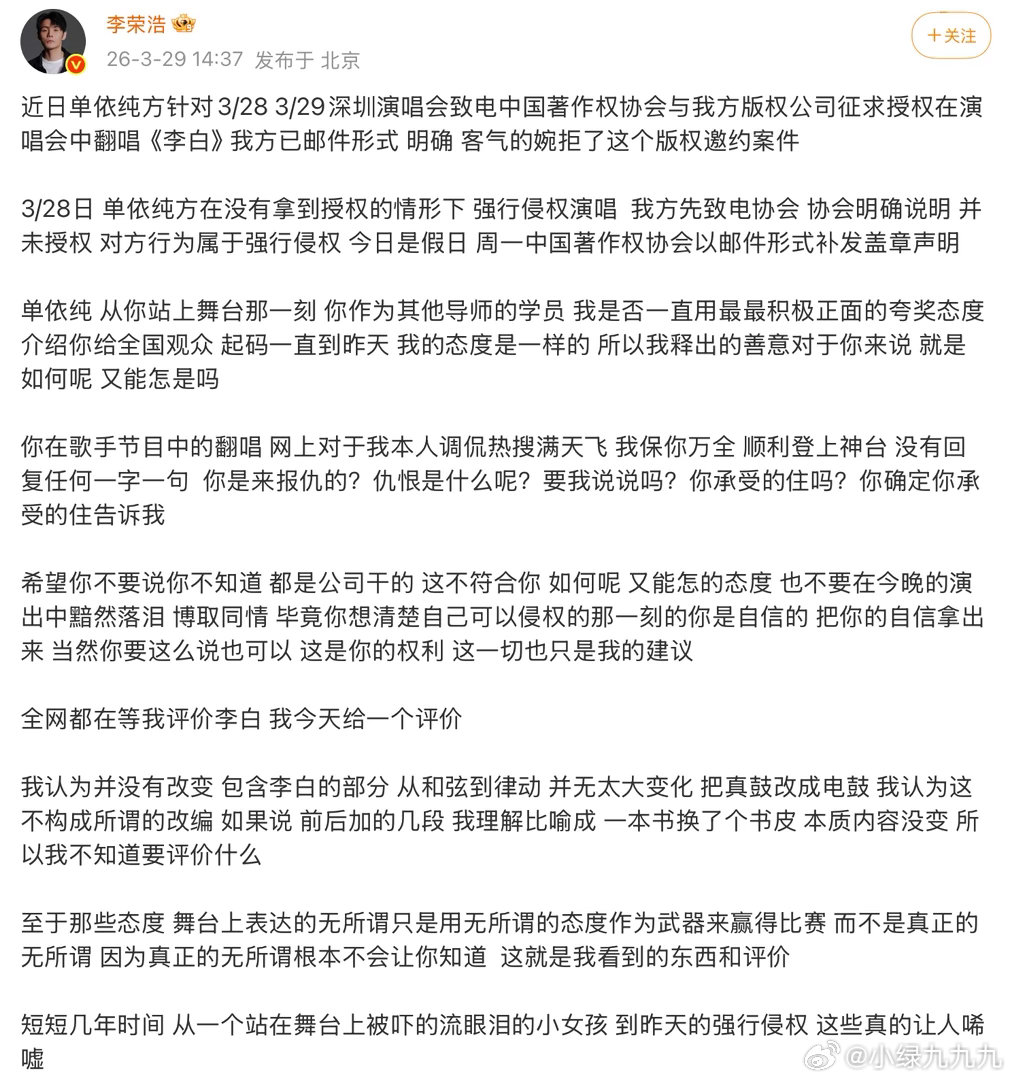 李荣浩4连质问单依纯李荣浩出来质问单依纯为什么没得到授权还是在演唱会唱了《李白》目前单依纯已经道歉了,大概意思是自己不清楚情况……