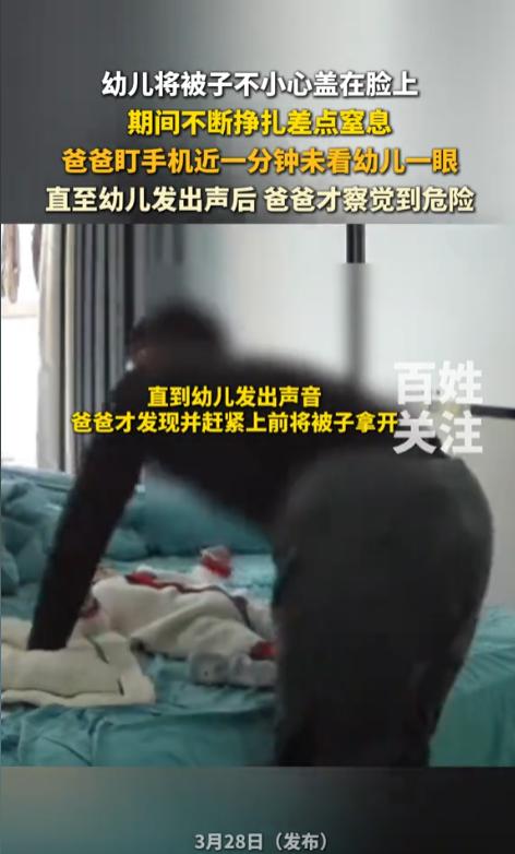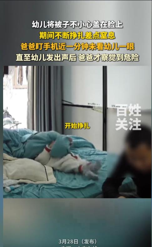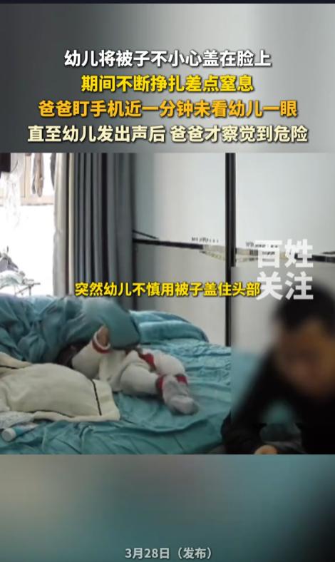 “心也太大了!”近日,湖北,一位宝宝在床上玩耍,宝爸在一旁看手机。这时候,宝宝不小心把被子盖到了脸上,呼吸不畅挣扎了起来,袜子都挣掉了,期间爸爸一直听着手机,直到宝宝出声才赶紧掀开了被子。宝宝:差点小命就没了! 没有危险的时候,爸爸就是最大的危险。这不是个段子,而是个经验。就是因为爸爸在带孩子的时候神经比较大条,自己会有意无意的给孩子带来危险。 据媒体3月28日报道,当日,只有宝爸一人在房间看着孩子。他见宝宝在床上一个人玩耍,就在一旁看手机去了。宝宝在玩的时候,不小心把被子糊在了脸上,顿时感觉不舒服就挣扎了起来。 可是宝宝实在太小,抓不动被子,怎么动都没办法把被子甩开。宝宝挣扎了得有一分钟,张牙舞爪的,袜子都被蹬掉了,随时都可能窒息。这期间,爸爸没看过他一眼。 直到最后,宝宝的嘴里发出了声音,宝爸这才意识到危险。转头一看,被吓了一跳,以迅雷之势把宝宝脸上的被子扯掉了。看到宝宝没有出什么事,才把心放下。 网友看后表示,带孩子最怕遇到这种事了,宝宝旁边有风险不排除,自己感觉良好,在一旁不管不顾,早晚出事了才去补救。看孩子的时候怎么能光顾着刷手机呢?孩子最喜欢抓东西的时候,怎么能放在被子角上呢?带孩子千万得打起12分精神来! 信息来源:《幼儿将被子不小心盖在脸上,期间不断挣扎差点窒息,爸爸盯手机近一分钟未看幼儿一眼。》百姓关注