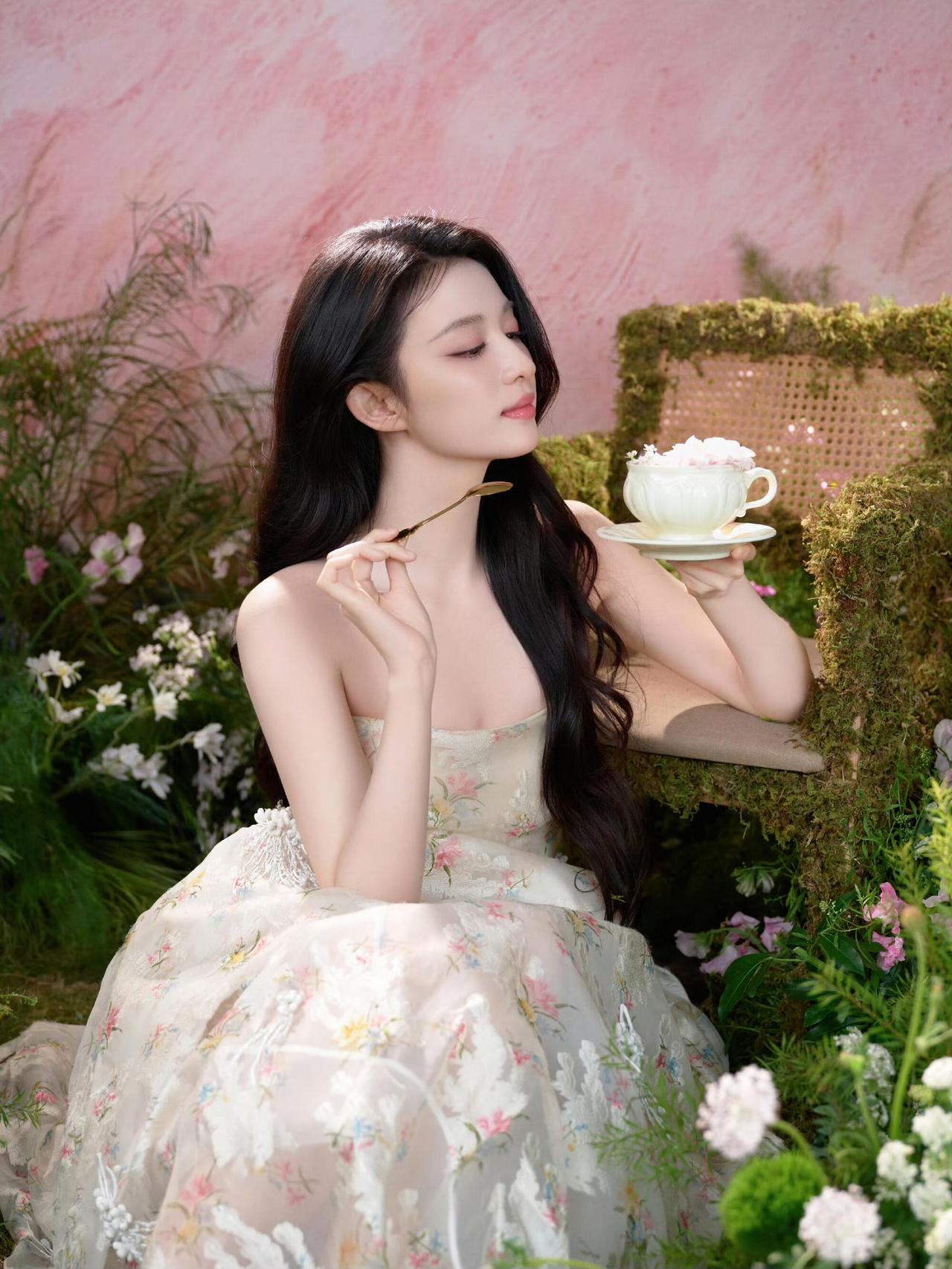 王楚然 粉墙晕开温柔的底色 你坐在苔藓织就的椅上 裙裾漫过丛生的花事 像把整个春天都穿在了身上 瓷杯盛着半盏粉雾 金勺轻叩时光的涟漪 指尖拂过雏菊的白 风也停在发梢 不敢惊扰 这片刻的柔软与安宁 阳光从叶隙漏下 在纱裙上绣出细碎的光斑 你抬眼望向远方 睫毛轻颤 抖落满肩的花香 连呼吸都裹着蜜色的甜 杯沿的花瓣簌簌落下 坠入青草丛间 像一封未寄出的信 藏着关于春日的所有秘密