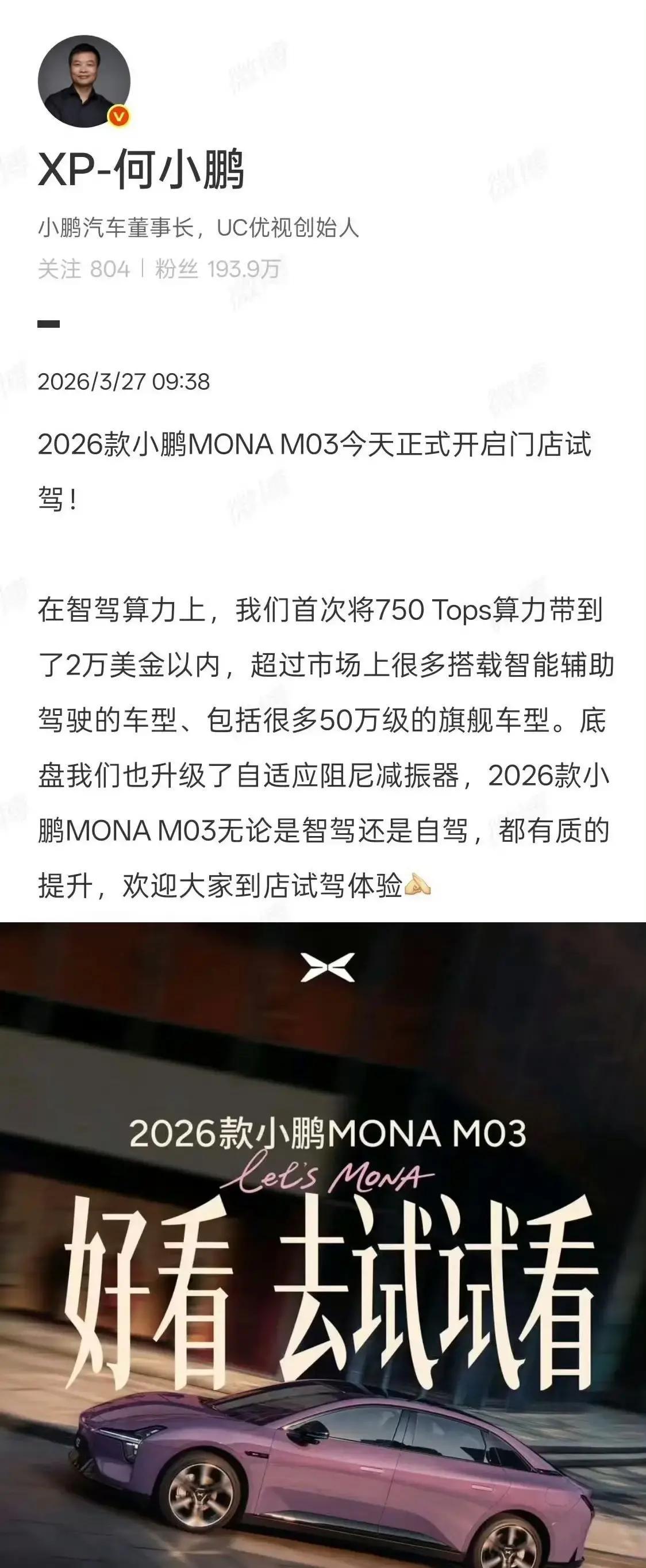 2026款小鹏MONA M03门店试驾拉开帷幕,何小鹏亲口放话:14万以内竟塞进750 Tops智驾算力,高端体验直降入门价位?