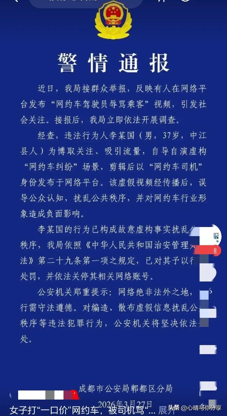 四川中江这位“网约车司机”李某这会儿可能挺后悔的吧, 没想到一时贪欲,不仅“火”了,还喜提账号封禁,网红梦彻底破碎,还可能面临行政拘留! 近日,37岁男子李某国为博取关注、吸粉引流,自导自演虚构“网约车纠纷”场景,剪辑后以“网约车司机”身份发布视频,视频内容显示司机要求乘客中途下车,并使用侮辱性语言。相关视频扩散传播后,引发公众对网约车行业的质疑。警方接群众举报后开展调查,确认视频系自导自演。 但李某的故事,远不止于一则“假戏真做”的网络闹剧。它背后,映射出的是当下社会对流量和关注度的疯狂追逐,是许多人在“快钱”和“快感”面前迷失自我的真实写照。 试想,一个普通的网约车司机,平日里或许默默无闻,收入稳定却不算丰厚。突然之间,他发现只要制造一点“话题”,哪怕是负面的,也能迅速吸引成千上万的目光和点赞。于是,他选择了铤而走险,用虚假和煽动性的内容换取一时的“爆红”。这不仅是个人的选择,更是一面镜子,照出了我们这个时代的浮躁和焦虑。 更让人心疼的是,这样的行为一旦被揭穿,代价极其惨重。李某不仅账号被封,失去了网络上的“身份”和“话语权”,更可能面临法律的制裁。那些曾经涌向他的视频点赞和评论,也瞬间变成了嘲讽和指责。曾经的“明星”变成了众矢之的,这种落差感,恐怕只有亲身经历过的人才能体会。 然而,这件事也给我们敲响了警钟。在信息爆炸的时代,每个人都可能成为内容的生产者和传播者,但这份权力伴随着责任。虚假信息和恶意炒作不仅伤害了行业的形象,更破坏了公众的信任。我们需要的是更多真实、正能量的声音,而不是为了流量不择手段的博眼球。 更深层次地说,李某事件背后反映的,是社会对普通劳动者的关注缺失。为什么一个网约车司机会选择用这样极端的方式表达自己?是因为现实生活的压力,还是对自我价值的迷茫?当我们在吐槽和批判的同时,也应当反思,如何为这些“普通人”提供更多尊重和理解,让他们在现实中找到自我价值,而不是在虚拟世界里铤而走险。 你是否也曾被类似的“爆款”视频吸引过?你是否也对那些“网红”的一举一动感到好奇甚至愤怒?欢迎在评论区吐槽,分享你的看法。毕竟,只有大家共同参与,才能让网络空间变得更清朗,让每一个普通人都能被温柔以待。