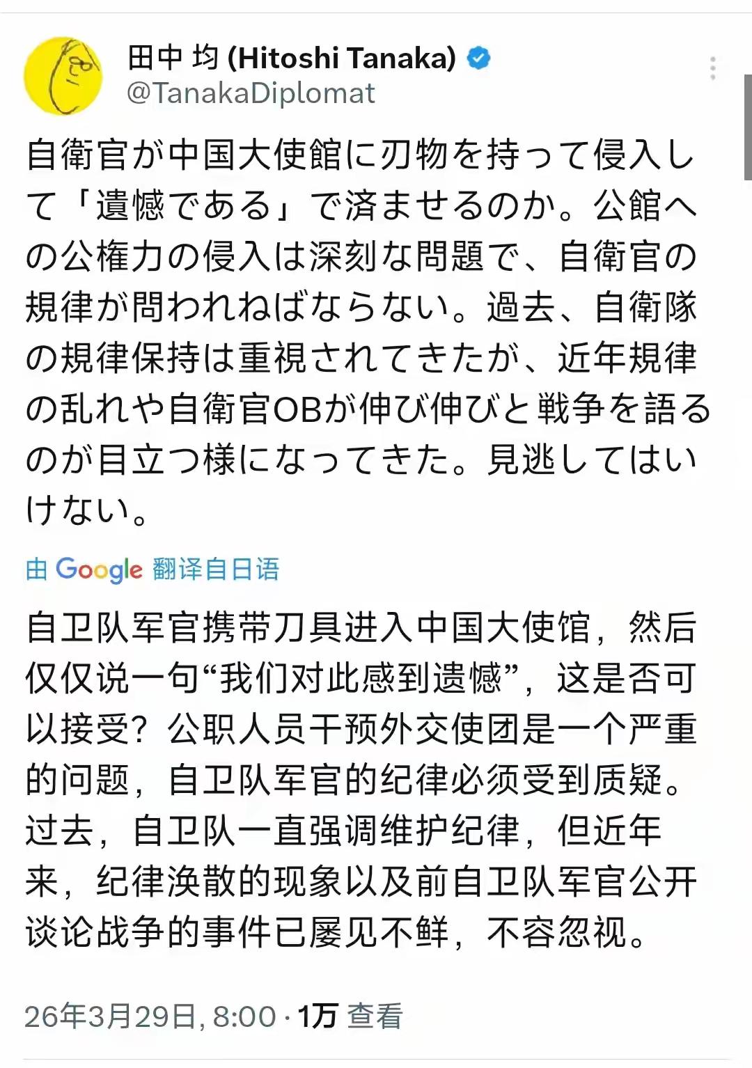 日本高官怒斥:一句“遗憾”岂能了事?3月29日,前日本外务省外务审议官田中均公开撰文,对现役日本自卫队军官持刀闯入中国大使馆一事发出严厉质问。他直言,仅仅以一句“感到遗憾”来回应如此恶性事件,完全不可接受;公职人员公然冲击外交使团,是极为严重的外交事件,自卫队的军纪必须受到彻底质疑。他还一针见血地指出,过去自卫队一向标榜纪律严明,可近年来纪律涣散、前自卫队员公开鼓吹战争的现象层出不穷,已经到了不容忽视的地步。 这番来自日本外交界资深人士的批评,绝非普通舆论吐槽,而是戳破了日本当前最危险的真相:极端思想蔓延军营,军纪全面失控,而政府却在刻意纵容、淡化处理。 一名现役自卫队军官,携带凶器强行闯入中国驻日大使馆,意图明显、行为恶劣,在国际法上属于严重的主权侵犯。驻外使馆是一国主权的延伸,受《维也纳外交关系公约》严格保护,冲击使馆、威胁外交官,等同于对一国主权的直接挑衅。可如此严重的恶性事件,日本政府和防卫部门却轻描淡写,仅用一句“遗憾”试图草草收场,既不彻查背景,也不追究责任,更不作出正式道歉,完全无视国际公约与外交基本准则。 田中均的批评,恰恰点出了问题的核心:这不是孤立事件,而是日本自卫队整体军纪崩坏、右翼思想渗透的必然结果。近年来,自卫队内部违法乱纪、训练事故频发,部分现役及退役人员公然美化侵略、宣扬战争、煽动对华对立,早已不是个别现象。历史修正主义大行其道,极端民族主义抬头,军营不再严守和平底线,反而成为激进思潮的滋生地。 更令人警惕的是,日本政府一边对军纪废弛视而不见,一边加速推进扩军备战,大幅增加防卫预算,突破“专守防卫”原则,不断向战争边缘试探。一边纵容反华极端行为,冲击中国使馆、威胁外交官;一边模糊战争责任、淡化战争红线,这种双重态度极具危险性。 一句轻飘飘的“遗憾”,掩盖不住对国际法的践踏;表面的敷衍处置,暴露的是对极端势力的纵容。日本外交与防务体系的双重失序,不仅严重伤害中日互信,加剧地区紧张,更给整个亚太安全埋下巨大隐患。 田中均的清醒发声,在日本右翼当道的氛围中尤为可贵。但如果日本政府继续回避问题、纵容危险倾向,不彻底整顿军纪、追究责任,未来必将付出更沉重的代价,亚太和平也将持续面临不可预测的风险。