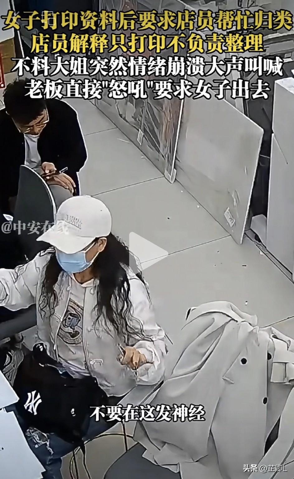四川一女子打印资料闹纠纷,要求店员整理被拒,当场崩溃大喊大叫,老板直接怒怼赶人!网友:不能惯着! 3月27日,四川发生一件让人挺无语的事。 一女子去打印店打印资料,打完之后居然张口要求店员帮她把资料归类整理好。 店员当场就跟她解释,开始就跟她说清楚了,店里只负责打印,不帮忙做整理归类的活。 结果这话刚说完,女子直接情绪崩溃,当场大声叫喊撒泼,完全摆出了一副撒泼的架势。 店里老板一看这情况,直接怒吼让她出去,明确表态:我们就是个打印店,不是来给你整理资料的! 说实话,打印店本来就只做打印的生意,提前都说好了服务范围,自己的资料自己整理不是应该的吗? 再说了,自己的资料只有自己才最清楚怎么分类,别人怎么知道应该怎么整理?这不就是胡搅蛮缠吗? 因为被拒绝就当众大喊大叫,也太离谱了吧!人家店里开门做生意,又不是你爸你妈,可不会惯着你! 自己觉着是撒娇,看在别人眼里是撒泼。 老板这波硬刚没毛病,真是没必要惯着这种无理要求! 大家觉得这事谁对谁错?评论区聊聊~ 素材来源:中安在线,侵联删!