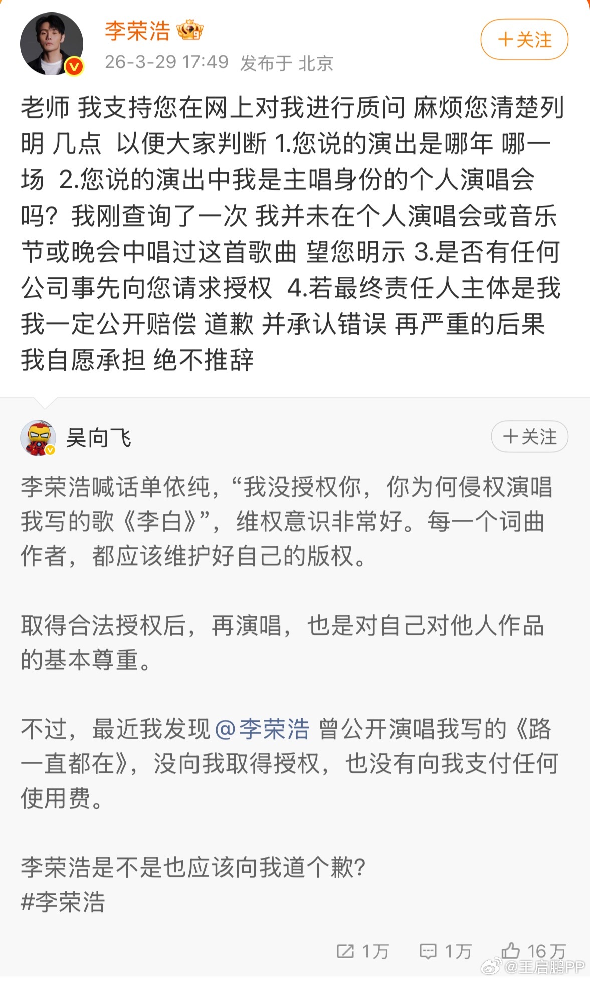 吴向飞喊话李荣浩道歉今天的李哥很“暴躁”,都别来沾边儿的气势!但其实我看到了一个创作者对原创和版权的尊重和保护,暴躁也是在理性之后的一种无奈应对方式,也没毛病。