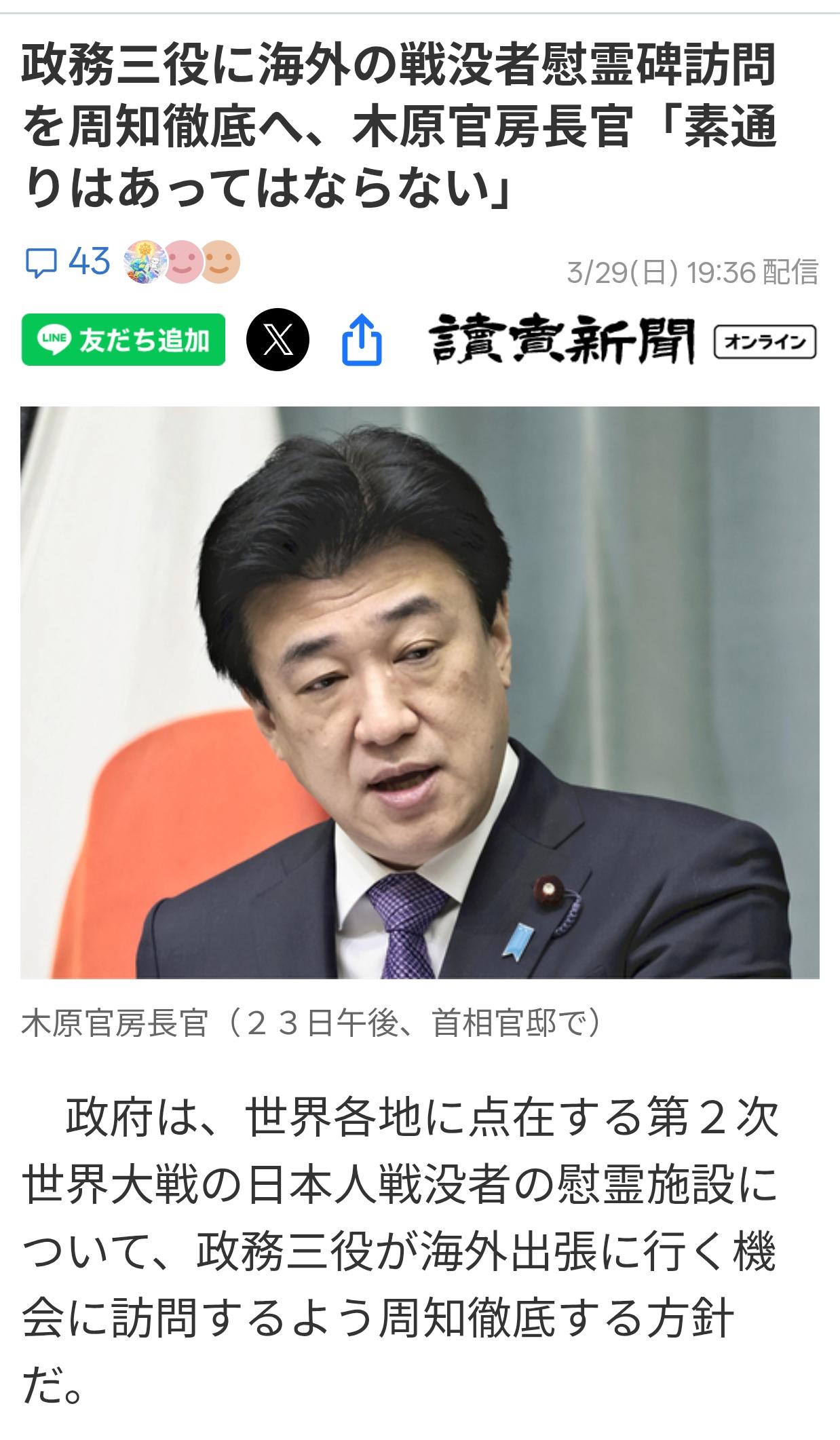 招魂:日官员海外出差须参拜当地日本阵亡者纪念碑 日本《读卖新闻》3月29日报道:日本内阁官防长官木原称:政府计划要求“政務三役”(各部委的大臣、副大臣和政务官),在出访海外时,必须参拜海外当地的日本二战阵亡者纪念碑等设施。 内阁官房长官木原于26日参加自由民主党志愿者发起成立的“纪念并致敬二战阵亡者,怀抱对和平的希望”协会(会长:野村哲郎参院议员)举行的大会。 木原说:“要切实向各个部委和机构呼吁,高级政府官员海外出差期间,必须参拜当地的日本人二战阵亡者纪念设施”。 木原说:在硫磺岛和菲律宾等地发生过激烈战斗,之后日本人阵亡者的纪念碑散布在各地。 据日本厚生劳动省统计,日本政府在各地共立有15座纪念碑,私人组织竖立的纪念碑,已知的有700多座。