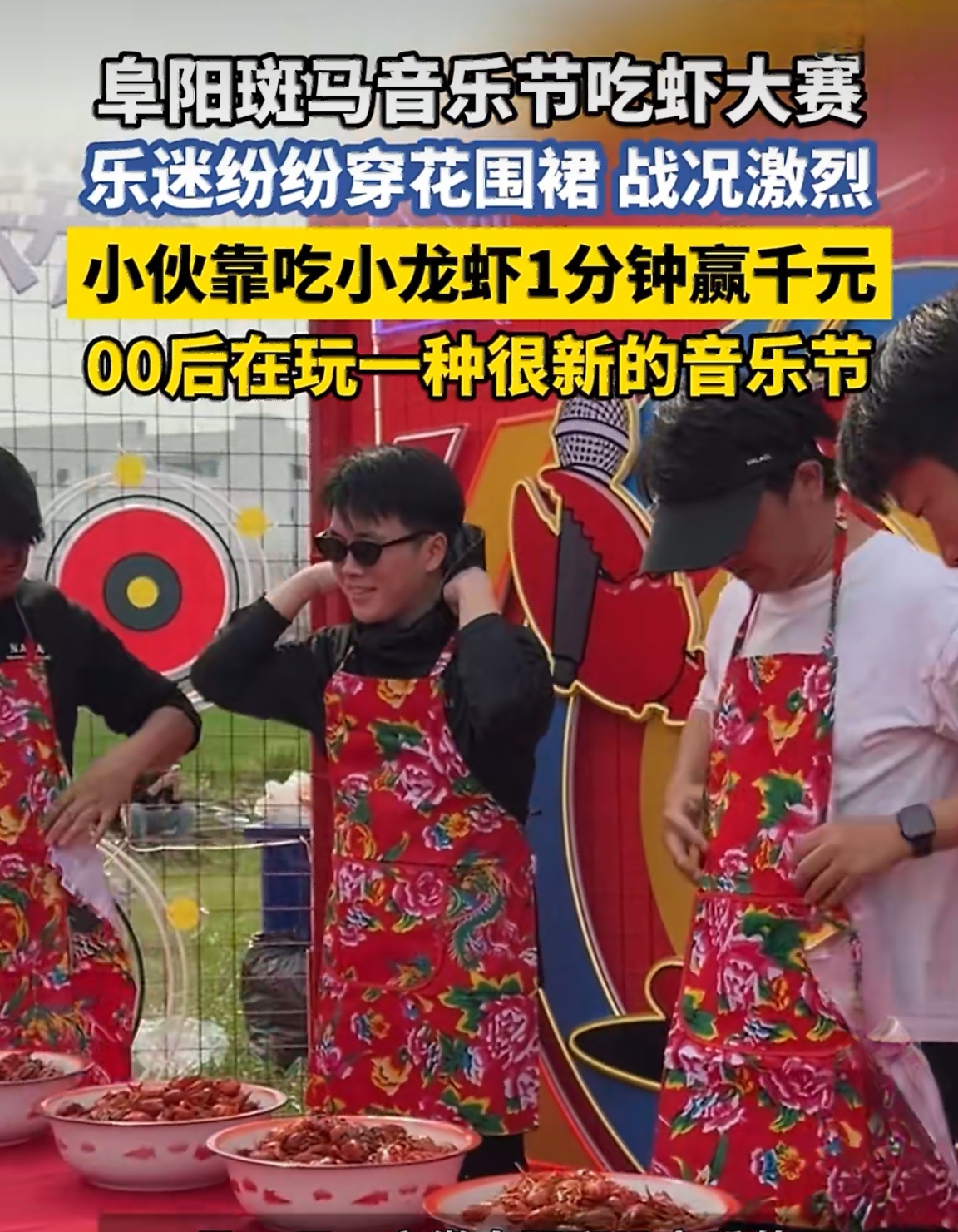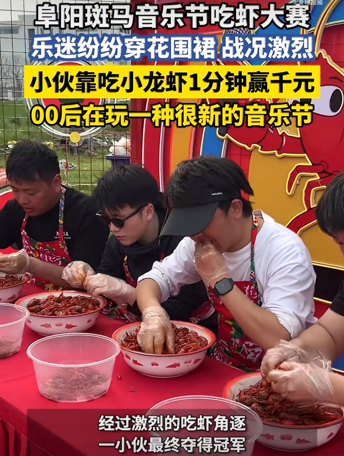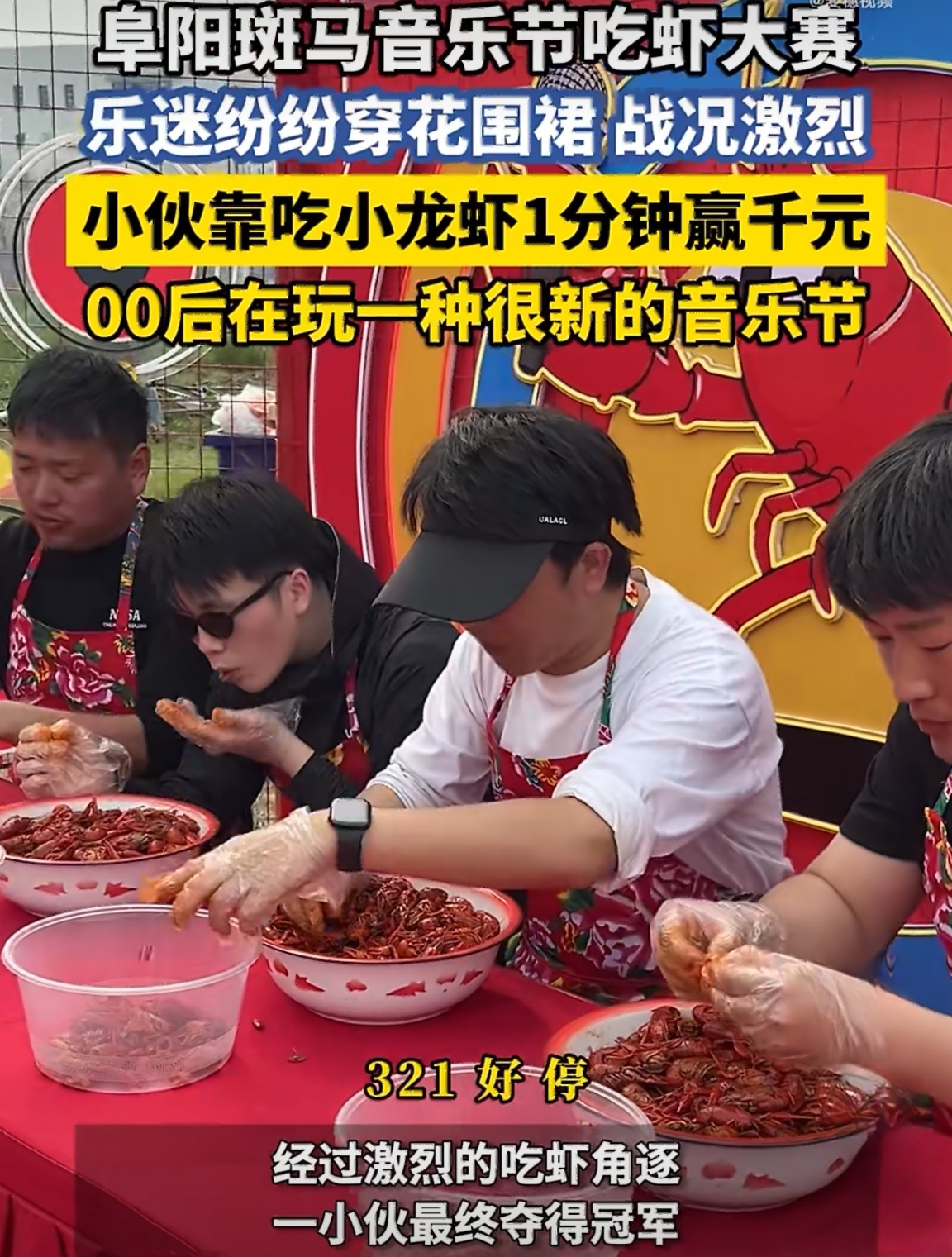 00后滚人在玩一种很新的音乐节这届00后滚人是懂玩音乐节的!音乐节直接变身小龙虾流水席,摇滚配花围裙,一边甩头一边剥虾,一分钟炫出千元大奖,太硬核了!以后音乐节没点才艺都不好意思去,看得我都馋了,求全国巡虾小伙靠吃小龙虾1分钟赢千元