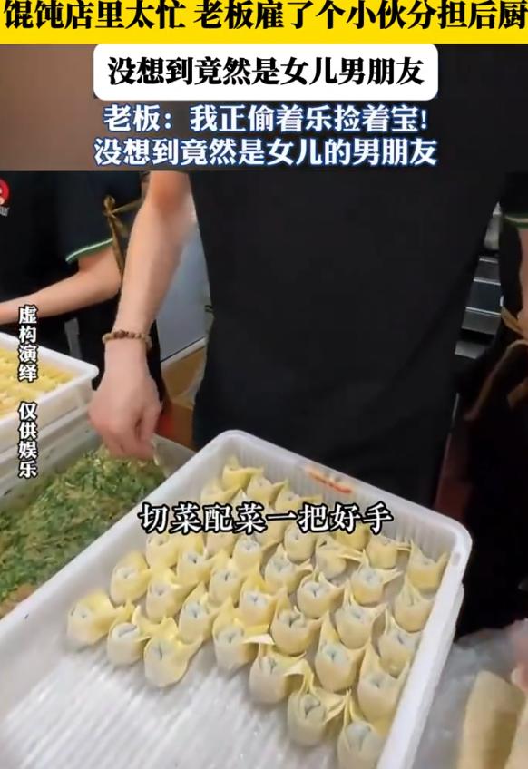 男子开了家馄饨店,因为顾客多,每天太忙,就找了一个小伙子到店分担后厨的工作,看对方手脚勤快,还以为捡到宝了,结果却发现这是女儿的男朋友。   事情的起因很简单,男子在小区附近开了一家馄饨店,主打手工现包馄饨,用料实在、味道地道,开业没多久就积累了不少回头客,生意一天比一天红火,每天从清晨五点多备货,到晚上十点多收摊。   他一个人既要和面、调馅、包馄饨,又要煮制、出餐、收拾卫生,常常忙得连喝口水的时间都没有,有时候忙到深夜,腰都直不起来,久而久之他实在撑不住,就想着找一个手脚麻利的小伙子来后厨帮忙,分担一些体力活,也能让自己稍微轻松一点。   他没有通过中介,只是在店门口贴了一张简单的招工启事,写明招后厨帮工,要求踏实肯干、手脚勤快,薪资待遇也说得明明白白。   没过两天,一个二十出头的小伙子找上门来,身材挺拔,看起来干净利落,说话也很实在,说自己能吃苦,愿意好好干,男子简单问了几句,看小伙子眼神诚恳,不像游手好闲的人,就当场答应让他第二天来上班。   小伙子上岗后彻底打消了男子的顾虑,每天早上比男子到店还早,一来就主动打扫后厨卫生,把食材分类整理好,手脚麻利得很,包馄饨的时候,手法娴熟,速度一点不比男子慢,包出来的馄饨大小均匀、模样周正,完全不用男子操心。   煮馄饨、配菜、收拾台面,每一样活都做得井井有条,哪怕店里顾客再多,他也不会慌乱,总能有条不紊地把事情做好。   男子看在眼里,喜在心里,私下里常常跟身边人念叨,自己真是捡到宝了,找了个这么能干的帮手,以后终于能轻松一点了,甚至还想着以后好好培养小伙子,让他帮忙打理店铺。   就这样过了差不多一个月,男子对这个小伙子越来越满意,不仅薪资按时发放,有时候还会留他一起吃饭,偶尔也会跟他聊几句家常,问问他的家庭情况,小伙子都一一如实回答,只是从没提起过自己有女朋友的事。   男子也没多想,只当是小伙子年纪还小,心思都放在工作上,直到有一天晚上,店里的顾客都走得差不多了,男子让小伙子先下班休息,自己留下来收拾收尾,就在他收拾到前厅的时候,远远看见小伙子没有走,而是站在店门口的路灯下,等着什么人。   没过几分钟一个熟悉的身影走了过来,正是男子的女儿,让他没想到的是,女儿走到小伙子身边后,很自然地牵起了他的手,脸上带着温柔的笑容,两人低声说着话,模样十分亲密。   男子瞬间愣在原地,脑子里一片空白,半天没反应过来,他仔细一看,确认眼前的小伙子就是自己招的后厨帮工,而自己的女儿竟然和他走在了一起。   后来男子才从女儿口中得知,小伙子其实早就和女儿在一起了,只是两人觉得还没到正式见家长的地步,就一直没说。   小伙子知道男子开馄饨店太忙,又听说在招帮工,就主动报名过来,一方面是想帮男子分担压力,另一方面也是想借着这个机会,多了解一下未来的岳父,用自己的实际行动证明自己是个踏实肯干的人,让男子放心把女儿交给自己。   得知真相后男子又好气又好笑,气的是两个孩子瞒着自己,好笑的是自己一直把未来女婿当成得力帮手,还到处炫耀自己捡到了宝。   不过经过这一个月的相处,男子对小伙子的印象越来越好,他能看出小伙子的真诚和踏实,也能感受到他对女儿的用心。   如今小伙子依旧在馄饨店里帮忙,只是身份不一样了,从后厨帮工变成了未来女婿,每天依旧勤勤恳恳,不仅把后厨的活打理得井井有条,还会主动帮男子分担更多的事情,一家人相处得十分融洽。   网友们得知这件事后,也纷纷调侃,男子以为自己招了个帮手,没想到是招了个未来女婿,看似是自己给小伙子发工资,实则是提前给自家女婿打工,这份缘分既奇妙又温暖。
