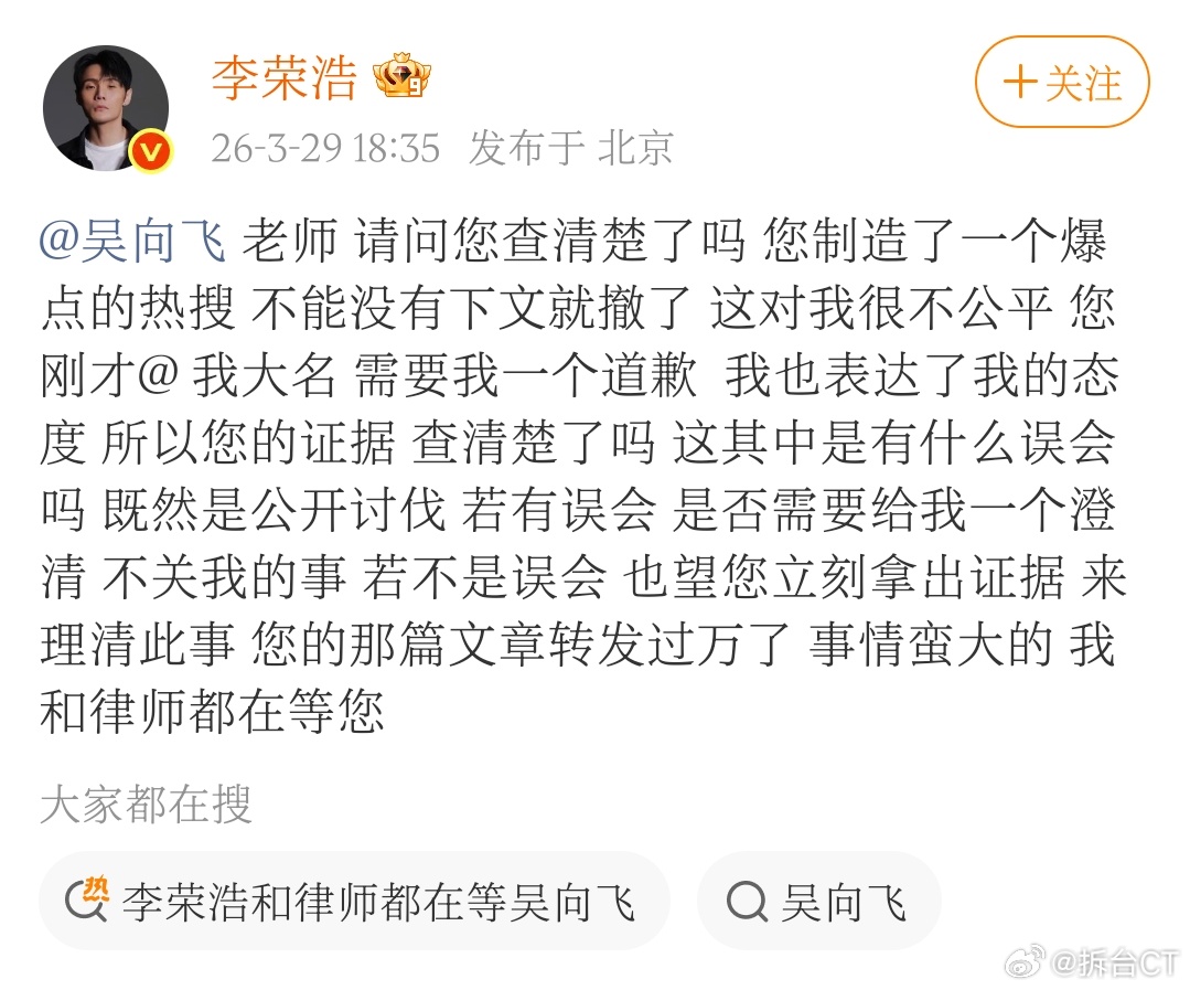稍晚,李荣浩又再次发文询问吴向飞,是否已查证清楚。