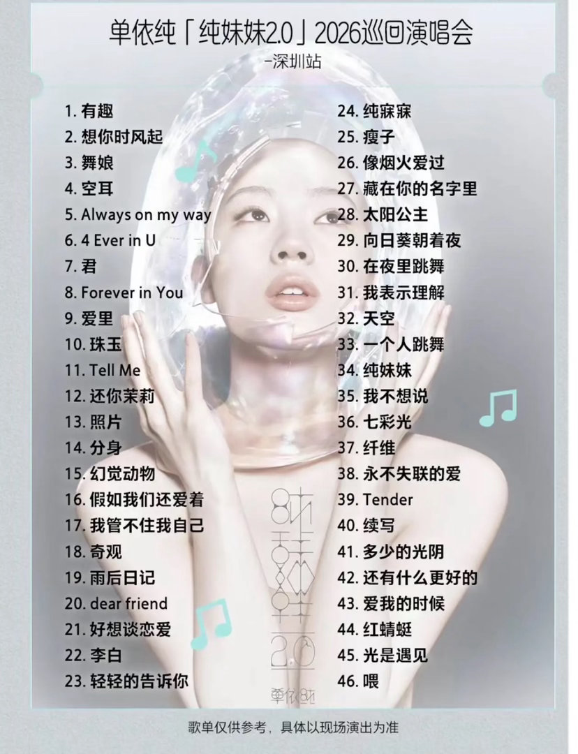 不查不知道一查吓一跳单依纯深圳演唱会46首曲目里,非原唱的曲目竟然有20首左右。