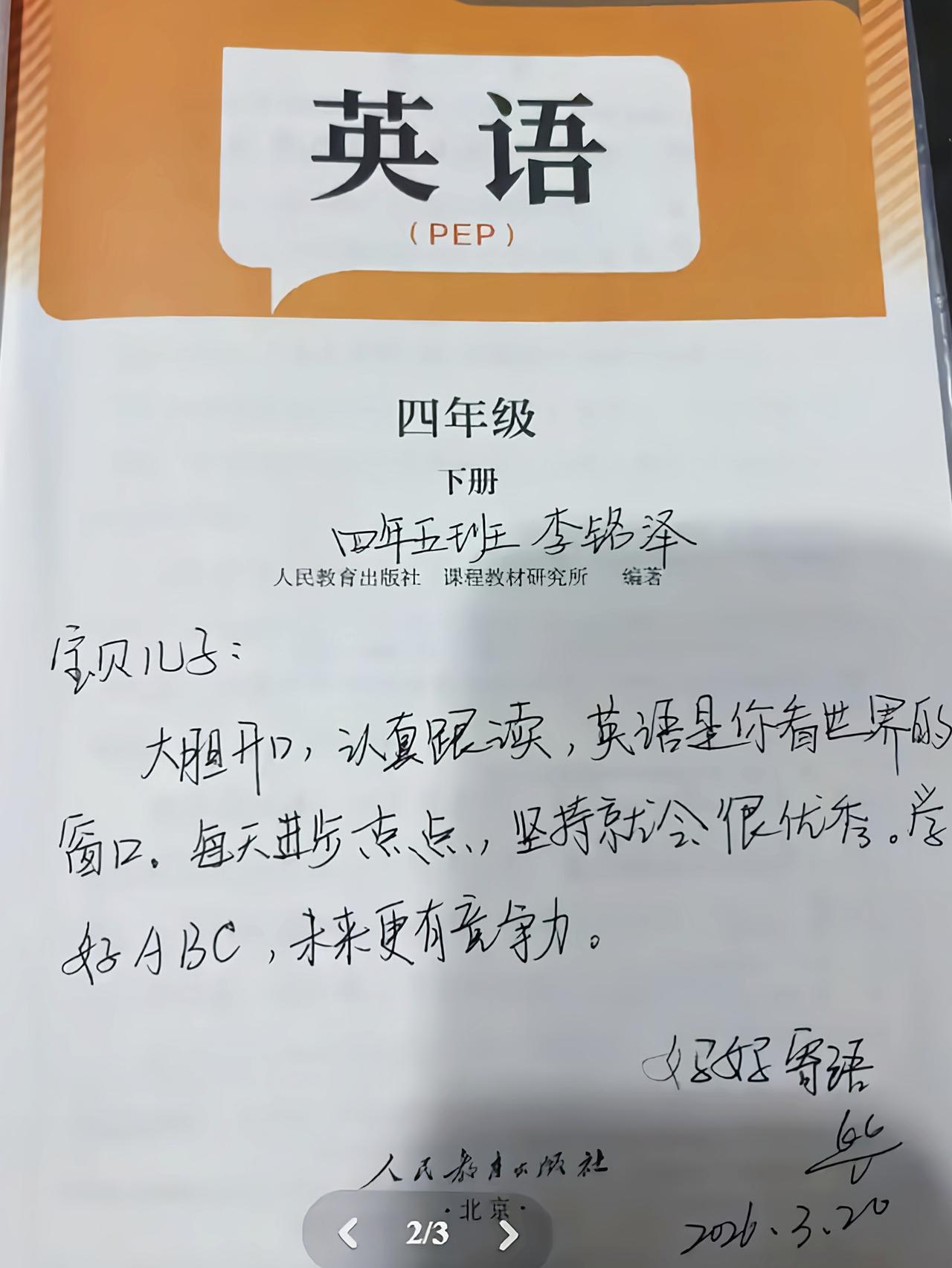 四年级的李铭泽,你要好好学习哟!全网都知道你妈妈在课本封面上,给你留下的寄语了。一位母亲写给四年级儿子的寄语,为什么会让很多人觉得丢了孩子的脸? 开过家长会的父母都知道,有时候在家长会上,老师会让我们给孩子写下一些寄语。在这些寄语中,有提醒、有祝福,也有与孩子的沟通。所写寄语的纸张,大多为普通的纸张。 不过下面这位妈妈,给儿子写寄语的方式就有点新颖了,她的寄语是写在儿子的课本封面上。 语文、数字、英语,不同的课本上写着不同的寄语,字里行间充满了母亲的温柔与关爱! 语文课本上,她写下“宝贝儿子:好好读书,认真写字,做个腹有诗书的小男子汉。一字一句皆成长,一言一行显修养。读万卷书,行万里路,语文带你看世界。” 数学课本上,她写下“宝贝儿子:细心算好每一道题,你就是小数学家。勤于思考,不怕难题,越思考越聪明。逻辑清晰,计算认真,数学让你更严谨。” 英语课本上,她写下“宝贝儿子:大胆开口,认真跟读,英语是你看世界的窗口。每天进步一点点,坚持就会很优秀。学好ABC,未来更有竞争力。” 看完这位妈妈写给儿子的寄语,除了感觉字写的漂亮,更佩服她流畅的文笔。 然而,这些充满关爱与鼓励的寄语传到网上后,却让一些网友觉得这种做法是在给孩子丢脸,容易闹成某种笑话,甚至会引起其他同学的讥笑。 有网友表示,从字体与文笔来看,她应该是一名受过高等教育的人。不过在写这些寄语的时候,她问过孩子同不同意,真正了解过四年级孩子的思维吗? 有位学生家长表示,已经想象到同学们围在她儿子旁边喊着“宝贝儿子——”起哄的场景了,甚至一进教室就会有人喊:“宝贝儿子来啦!” 也有网友表示,以后经常会有男同学喊他“宝贝儿子”,而女同学则会在一边笑。这样的场景,可能会成为李铭泽小朋友,小学时光中深深的记忆。 还有网友称,那位妈妈只不过是自我感动罢了。这种自我感动的教育方式,只会增加孩子的压力,甚至引起孩子的反感。 看到网友们的这些留言,难道那位妈妈真的做错了?写给儿子的寄语,真的能让孩子丢脸了?