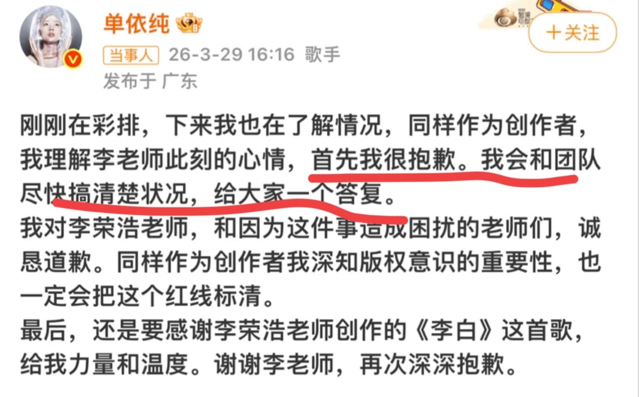 李荣浩这么敢说,以后和单依纯再见面真的不会尴尬吗?[呲牙][呲牙] 不过他预测的蛮准的,单依纯确实把责任都推给了团队。 至于今晚的演唱会有没有落泪卖惨,就得等现场的粉丝repo了。 话说单依纯也确实挺没品的,在人家明确拒绝授权的情况下,还公然在自己的商业演唱会中使用。 这是仗着自己粉丝多,公然挑衅李荣浩啊! 也难怪人家会这么生气! 网友调侃,👁小的男人,眼里更容不得沙子。 [呲牙][呲牙]