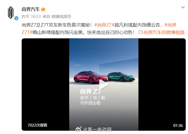尚界Z7 内饰提供超凡粉搭配内饰缥云杏方案,Z7T提供晚山新绿搭配内饰闪金黑方案