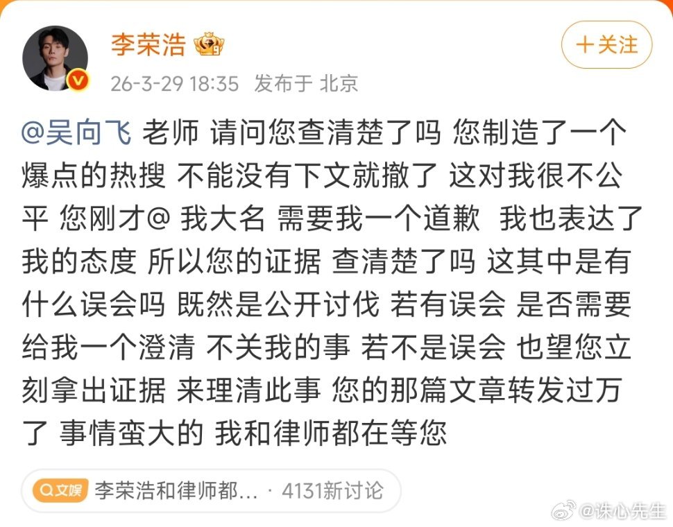 吴向飞喊话李荣浩道歉