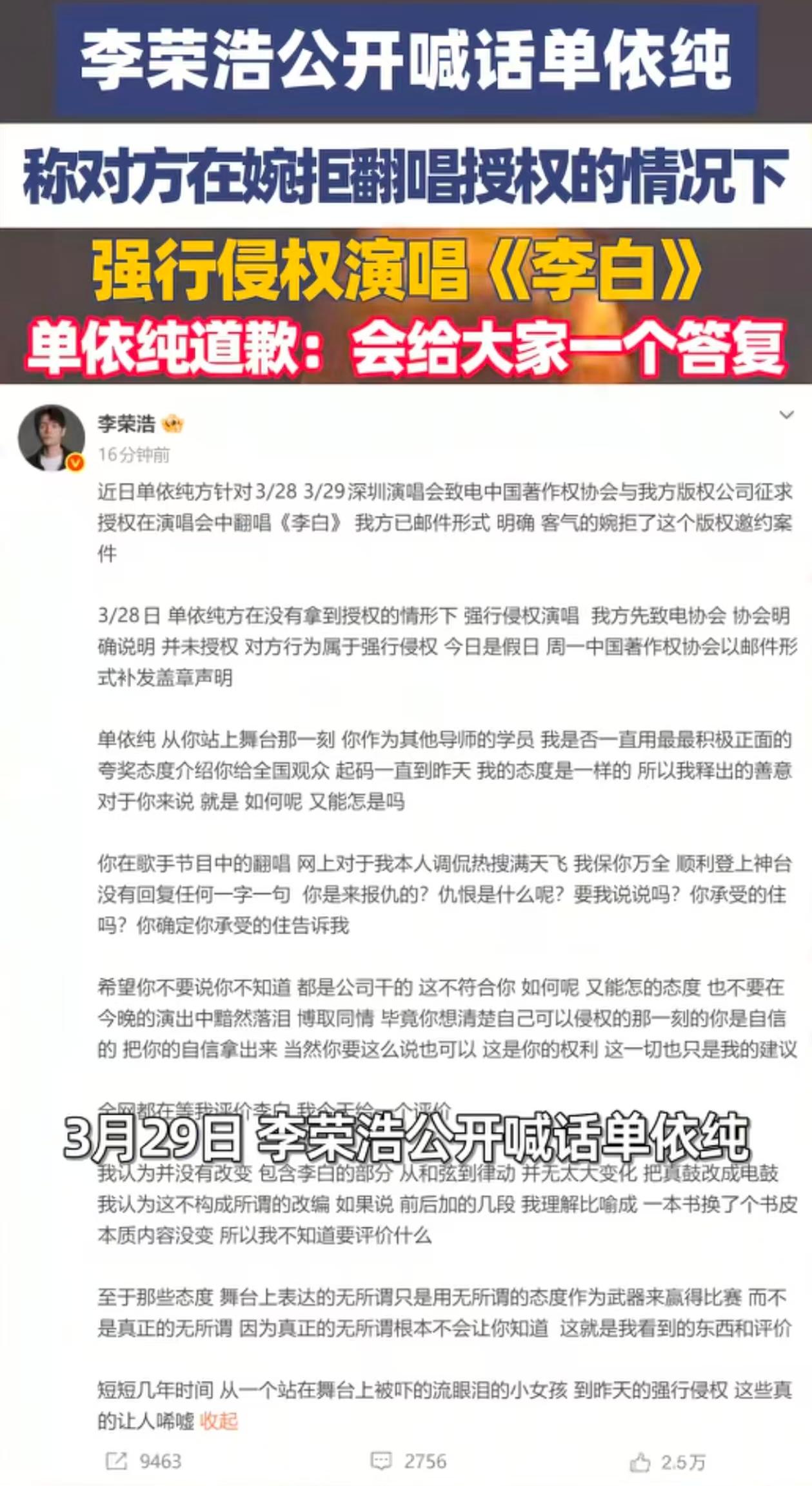 估计当初孟子义就听到一些风声。 孟子义在一期节目中,就问单依存把李白的歌加了那么多词,“李白”同意吗,其实她想问李荣浩同意吗? 李雪琴马上说李荣浩同意就行。孟子义当场给个白眼,当初孟子义因为这个白眼,还被单的粉丝黑了一段时间,那些粉丝都以为李荣浩是同意单依纯改编,而且李荣浩应该也喜欢改编的歌! 看了李荣浩的声明,感觉当初是嫌单依纯改的不好听,无奈把版权授给了节目组,加上为了照顾刚出道的小女孩,自己唱唱就算了,网上对他又不好的声音也忍了。 但是现在李荣浩还没同意把版权授给你,你就拿这首歌去开演唱会挣钱,谁能忍。