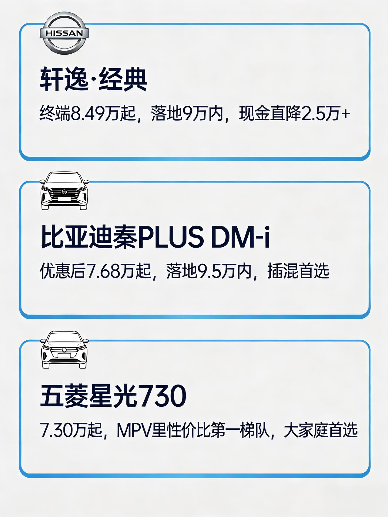 5-10 万买车别瞎选!8 年 4S 店经理掏心窝子推荐 预算 5-10 万买车怕踩坑?我在 4S 店见太多人买完就后悔!今天给你最实在的选购指南,看完闭眼选不亏! 【3 月最新行情】 轩逸・经典:终端 8.49 万起,落地 9 万内,现金直降 2.5 万 + 比亚迪秦 PLUS DM-i:优惠后 7.68 万起,落地 9.5 万内,插混首选 五菱星光 730:7.30 万起,MPV 里性价比第一梯队,大家庭首选 【配置选购核心】 1️⃣ 5-7 万:优先选标配 ESP + 胎压监测 + 双气囊的,这是安全底线,少一个都别买!推荐比亚迪海鸥 305km 舒适版,通勤代步超省,落地 7.5 万内。 2️⃣ 7-8.5 万:加 1 万 + 上倒车影像 + LED 大灯 + 无钥匙进入,宝妈和新手刚需,后期加装至少花 5000 还没原厂稳定。推荐轩逸・经典舒适版,省油耐开,家用稳妥。 3️⃣ 8.5-10 万:直接上高配!选带侧气帘 + 360 全景 + L2 辅助的,高速长途超省心,家用安全拉满。推荐秦 PLUS DM-i 120km 领先版,可油可电,亏电油耗 3.8L,一公里不到 2 毛钱。 【4S 店不会说的内幕】 后期加装 360 全景比原厂便宜 40%,但要拆车有异响风险;而 LED 大灯和 ESP 后期没法加装,必须原厂选!现在优惠 2.5 万以上才值得入手,别被 “限时特价” 忽悠早买。 【最终选购总结】 首推:秦 PLUS DM-i(无充电条件选轩逸・经典) 次推:五菱星光 730(大家庭)/ 比亚迪海鸥(通勤) 同价位备选:吉利帝豪、长安逸动 PLUS,都是靠谱选择。 【互动时间】 已购车的朋友:你买的哪款?后悔了吗? 意向购车的朋友:你更看重油耗还是空间? 点赞关注我,下期聊贷款买车的隐藏坑! 5-10 万家用车推荐 轩逸经典 秦 PLUS DM-i 五菱星光 730