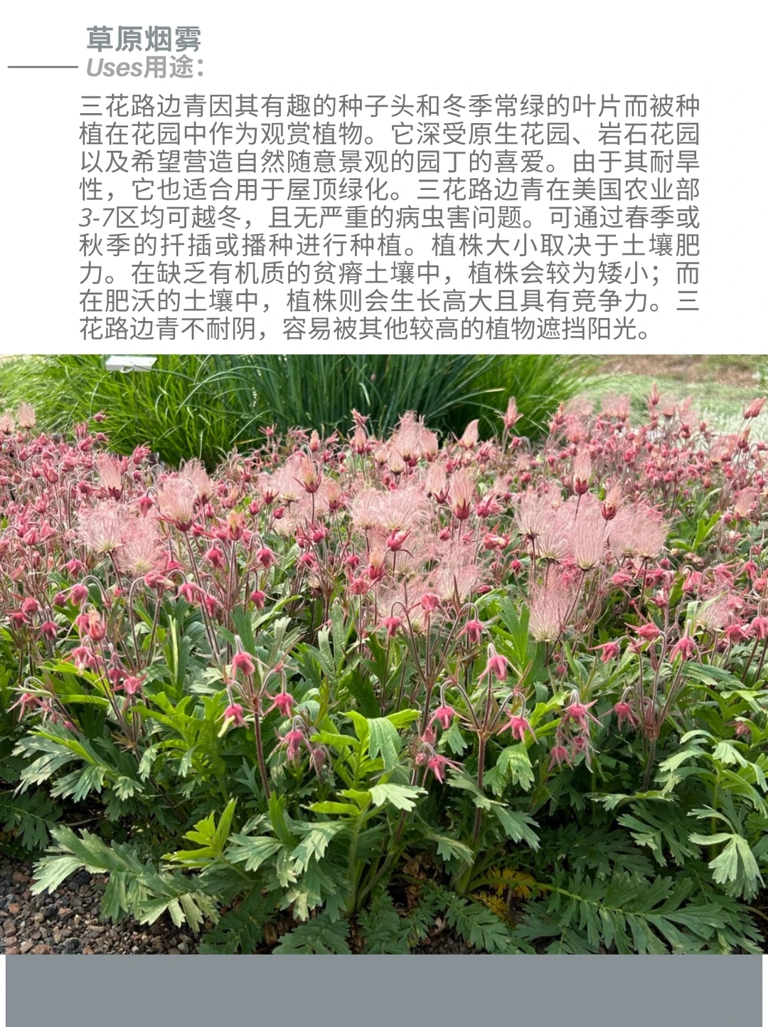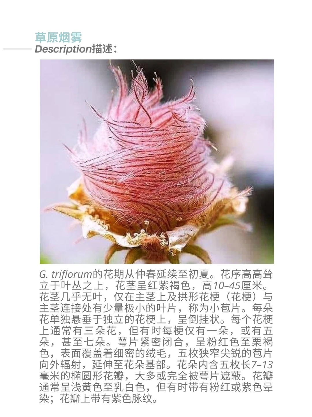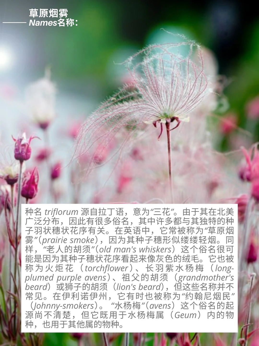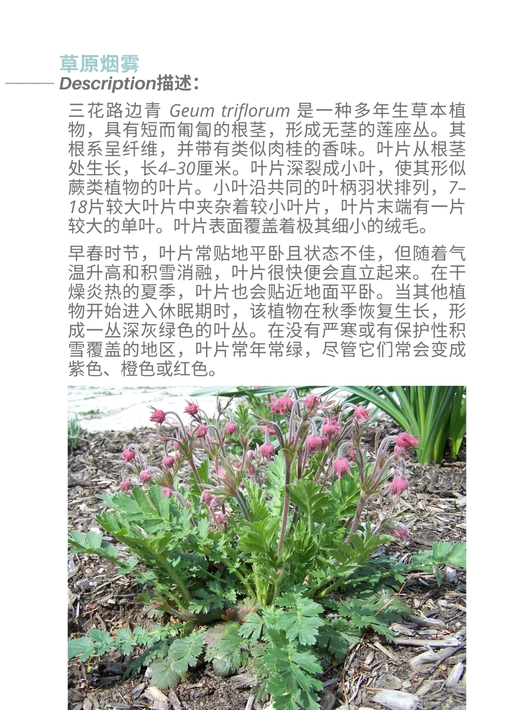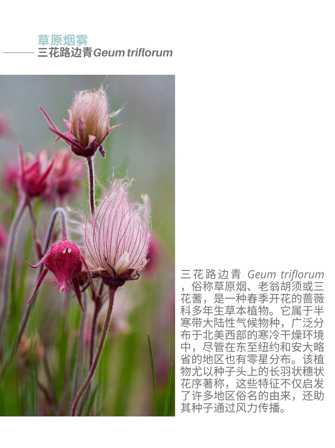 三花路边青 Geum triflorum ,俗称草原烟、老翁胡须或三花蓍,是一种春季开花的蔷薇科多年生草本植物。它属于半寒带大陆性气候物种,广泛分布于北美西部的寒冷干燥环境中,尽管在东至纽约和安大略省的地区也有零星分布。该植物尤以种子头上的长羽状穗状花序著称,这些特征不仅启发了许多地区俗名的由来,还助其种子通过风力传播。